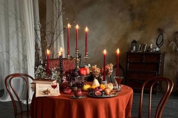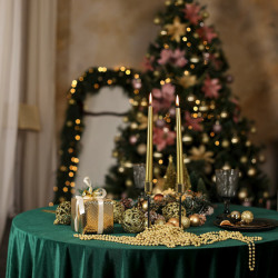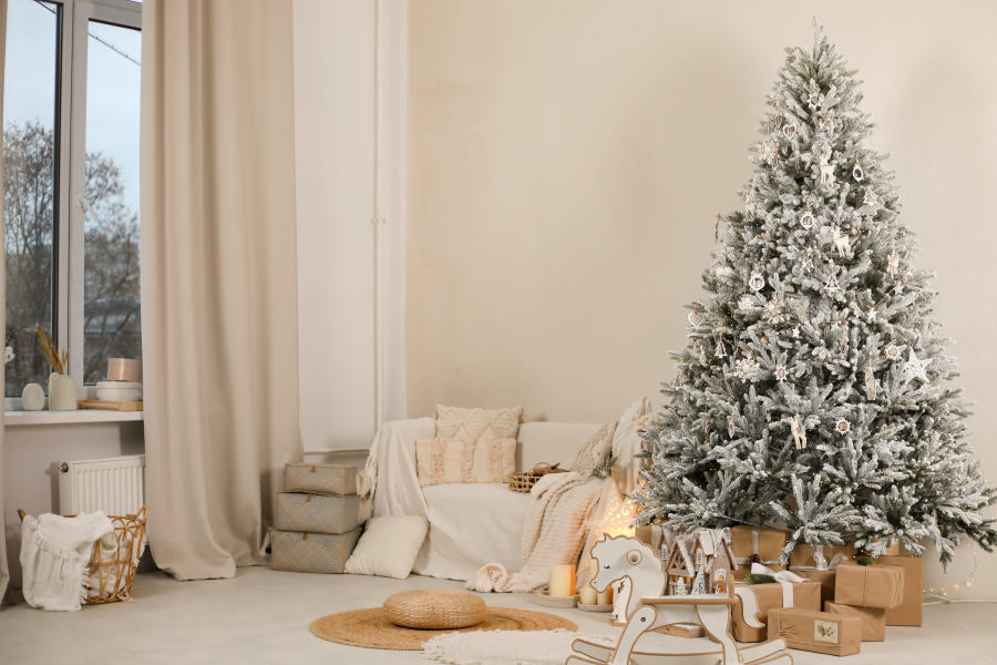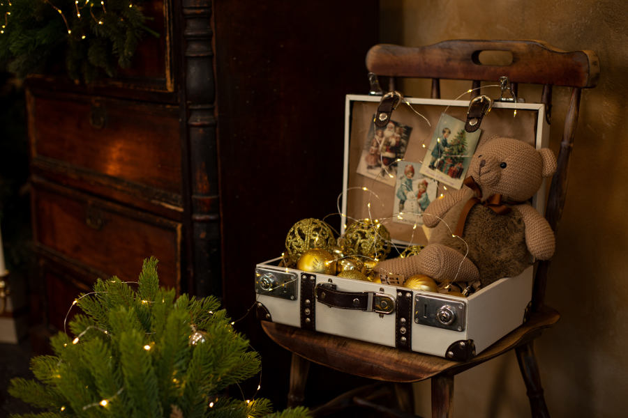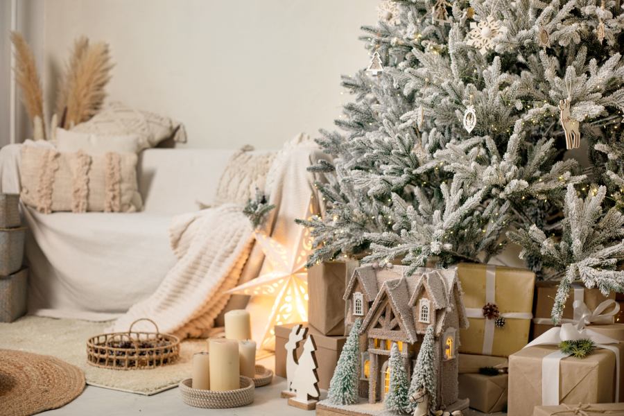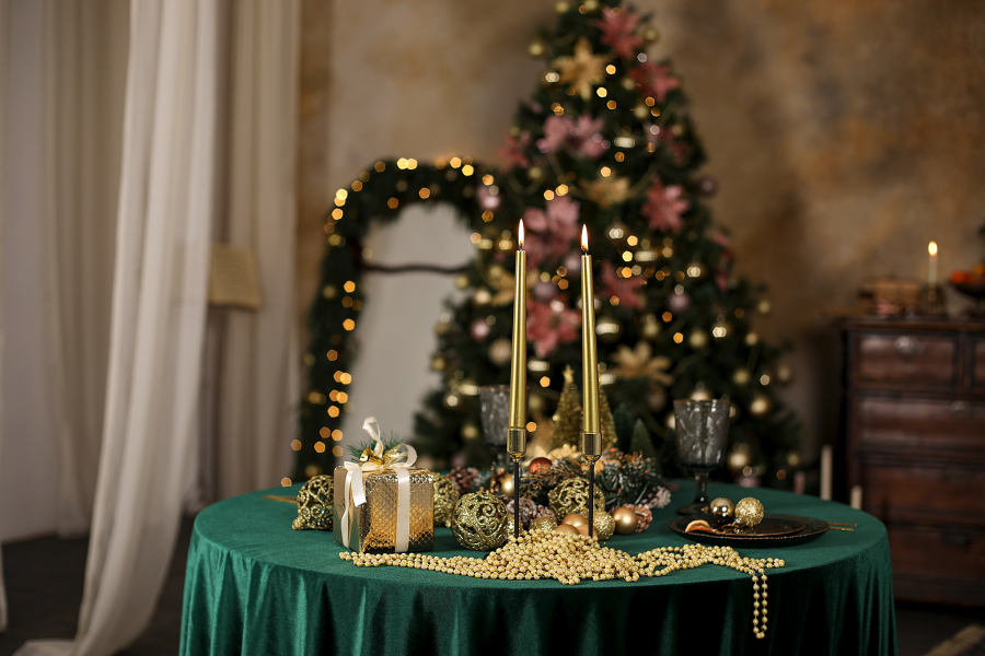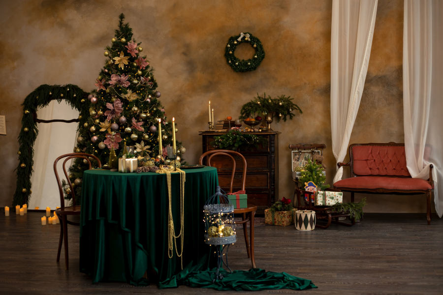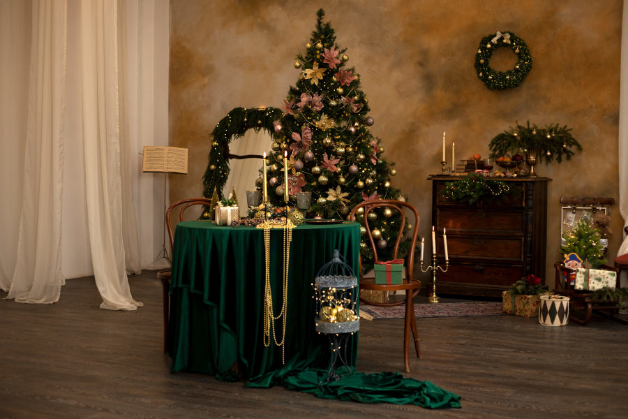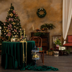 В зале 4 новогодние локации: Винтажная рождественская гостиная с сервированным столом. Светлая и уютная Сканди-зона с диваном и подарками. Детская винтажная и внесезонная зона. Красный фотофон....