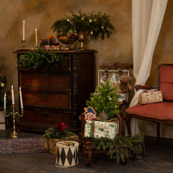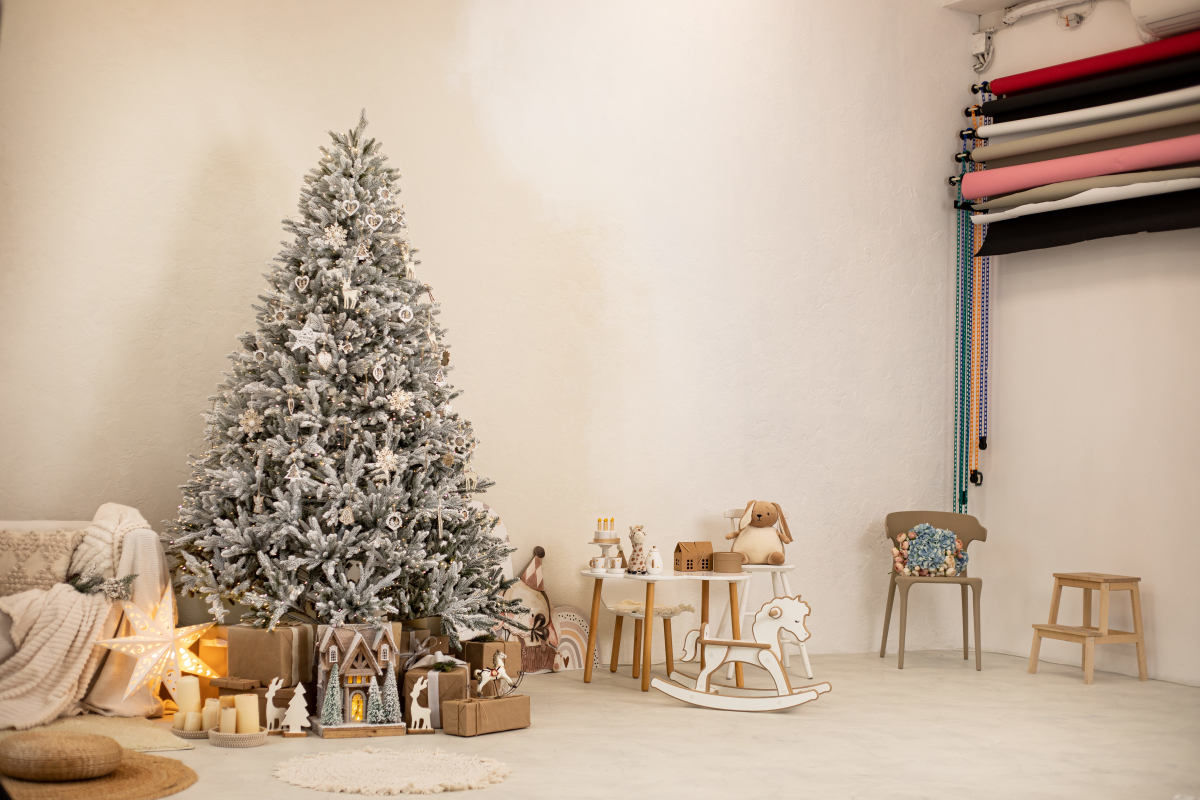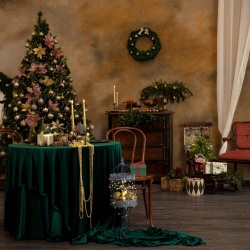 В зале 4 новогодние локации: Винтажная рождественская гостиная с сервированным столом. Светлая и уютная Сканди-зона с диваном и подарками. Детская винтажная и внесезонная зона. Красный фотофон....