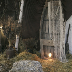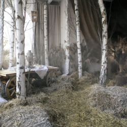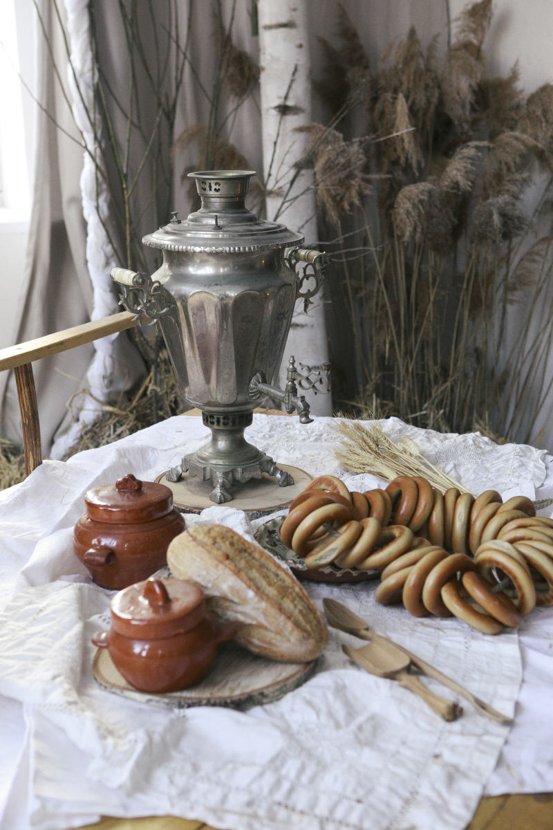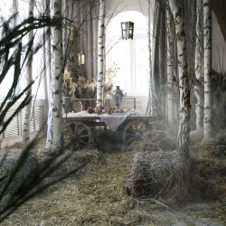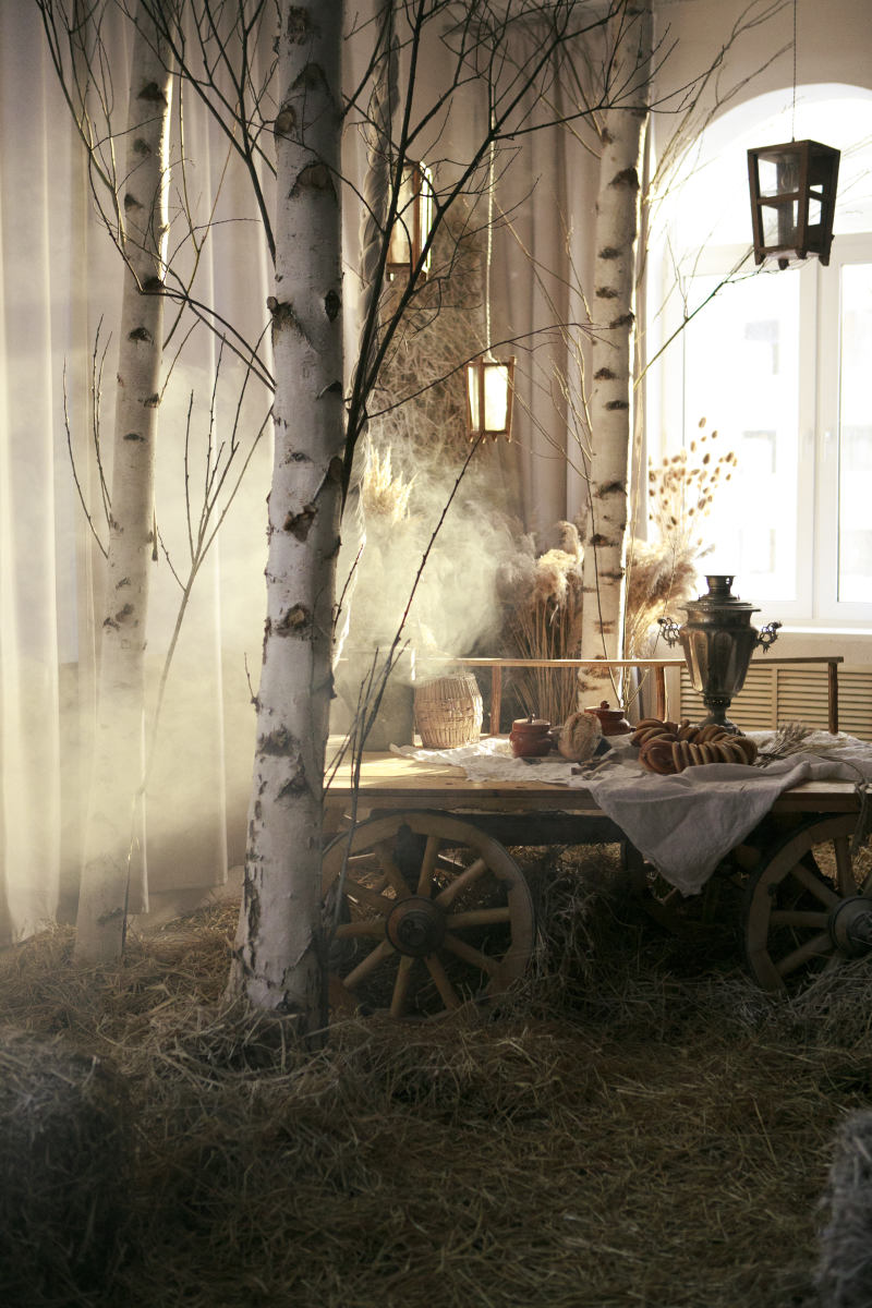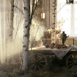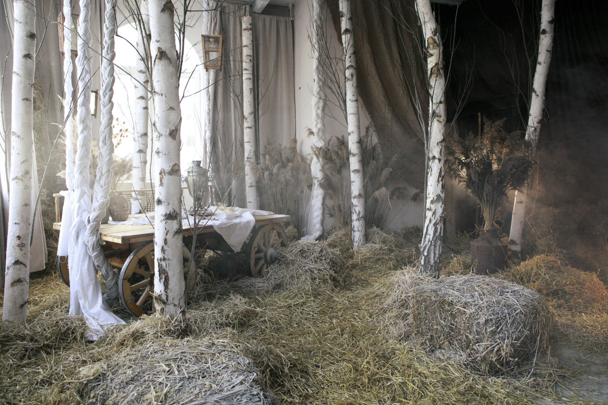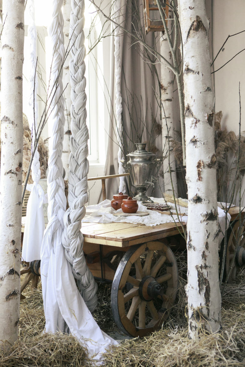 Берёзы, сухие травы, дерево и ткань складываются в спокойную композицию с русскими и сказочными мотивами, где важны фактура, свет и тишина.