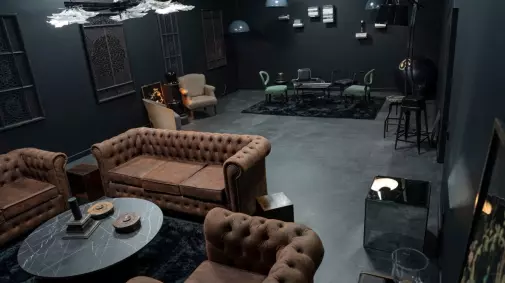 В нашем зале вы найдете зону со стеллажом, дизайнерский модульный диван на колесах, паркет ёлочкой с фактурными стенами и аркой, подвесные фоны, фактурные стены, много дизайнерских стульев, растения, арезное зеркало и большие окна!