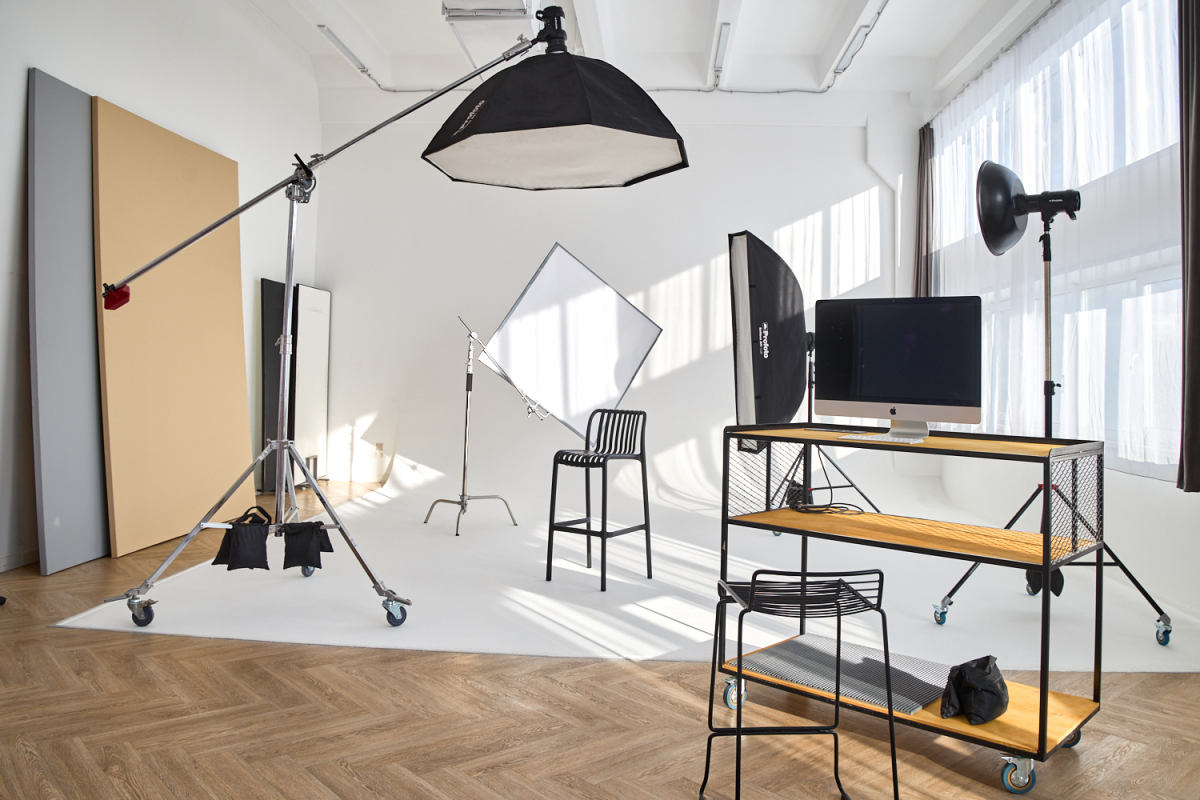 Светлый просторный зал с большой Циклорамой и белым углом в стиле ASOS.