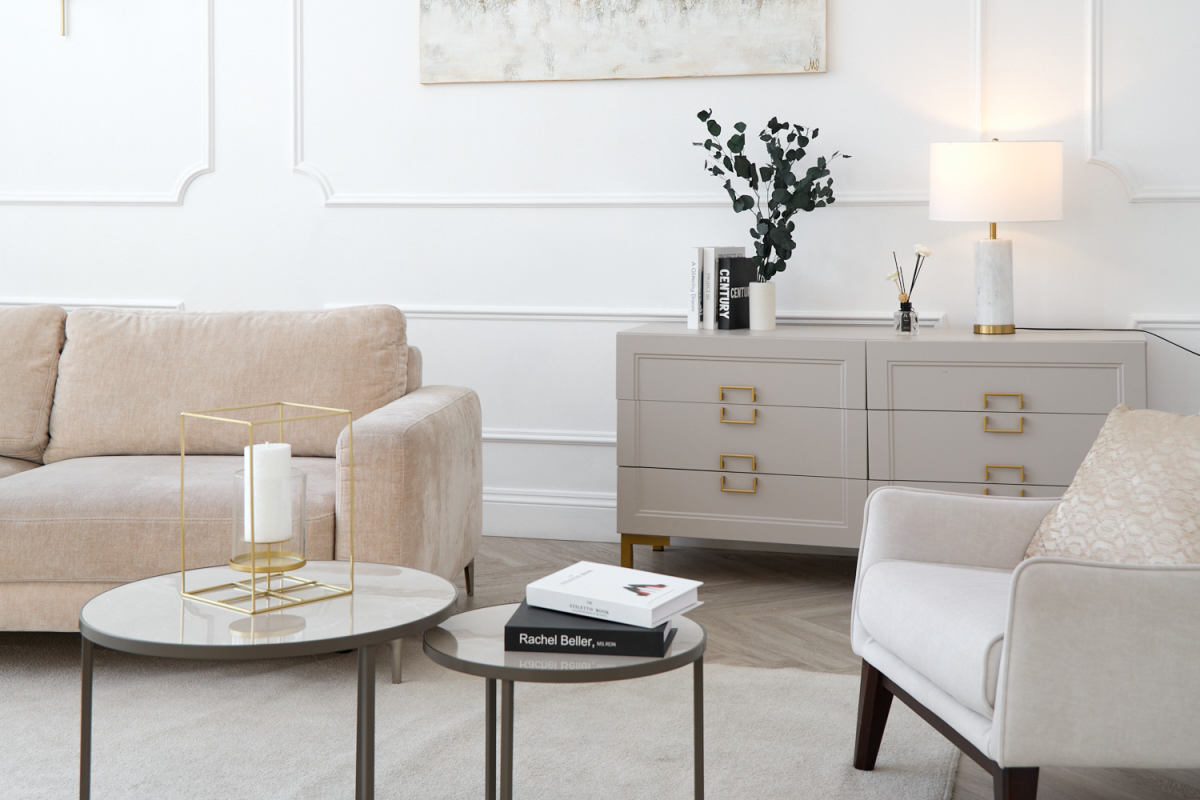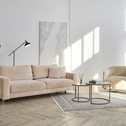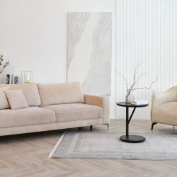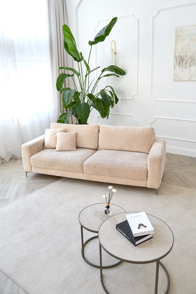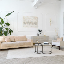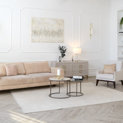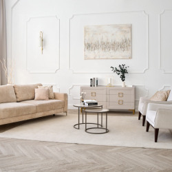 • Пол из кварцвинила под натуральное дерево бежевого цвета раскладкой ёлочка.