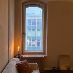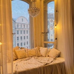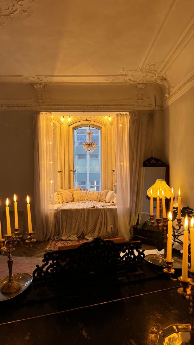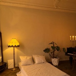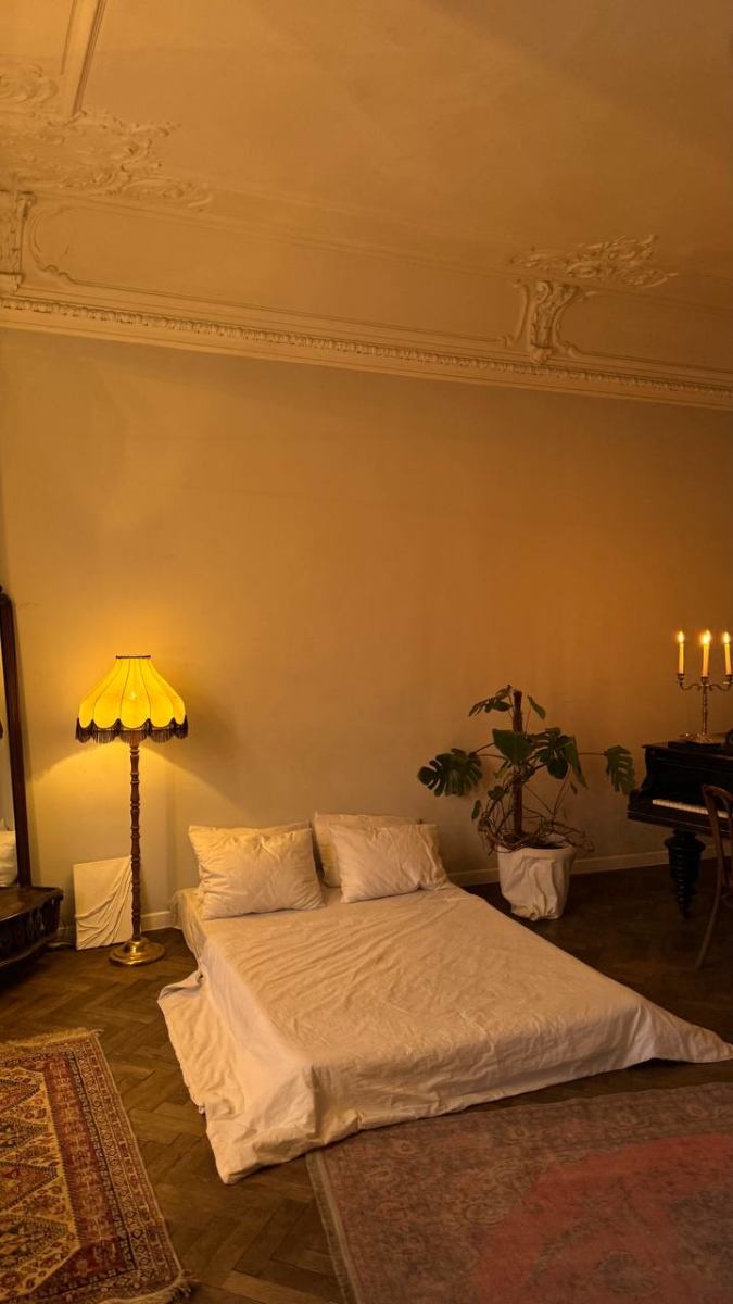 В комнате находится рояль, матрас, диван и стол. Также у нас есть проигрыватель, который поможет создать еще более творческую атмосферу во время съемки. Ну и, конечно, отдельного внимания заслуживает эркер и вид на сердце Петроградки — площадь Льва Толстого и театр им. А. Миронова.