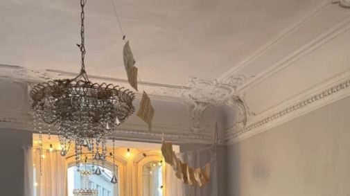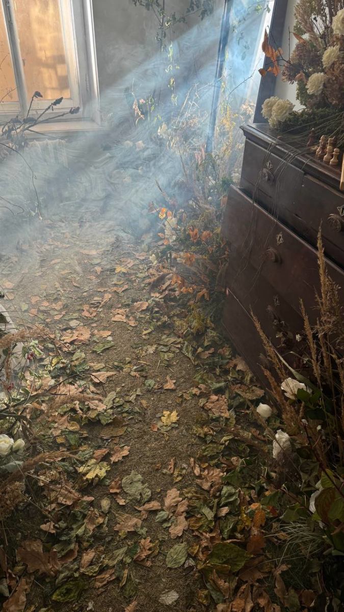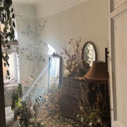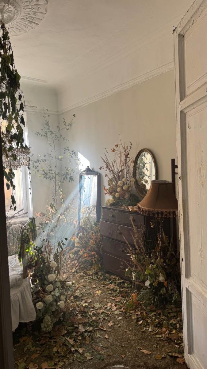 В зале находится стол, матрас, множество книг, цветы в небольших вазах