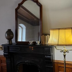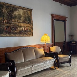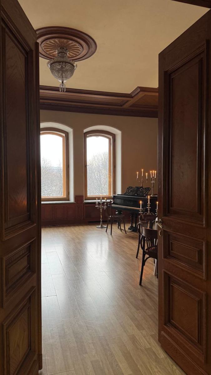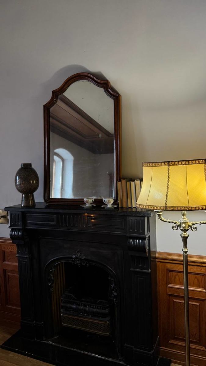 Отличительными особенностями зала являются деревянные панели «Буазери», расположенные по периметру зала, а также доминантой и отличительной изюминкой комнаты стал камин из темного мрамора. Эти детали являются историческим наследием и находятся под охраной Гиопа. Зал «Каминный» сочетает в себе элементы английского стиля загородных особняков: утонченные изгибы рояля перекликаются со сдержанным диванным ансамблем из темного дерева и ротанга. Стены комнаты украшают картины, гобелен. В углах зала также расположены круглый стол с массивными деревянными стульями и антикварный граммофон.