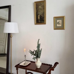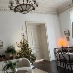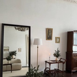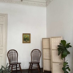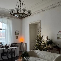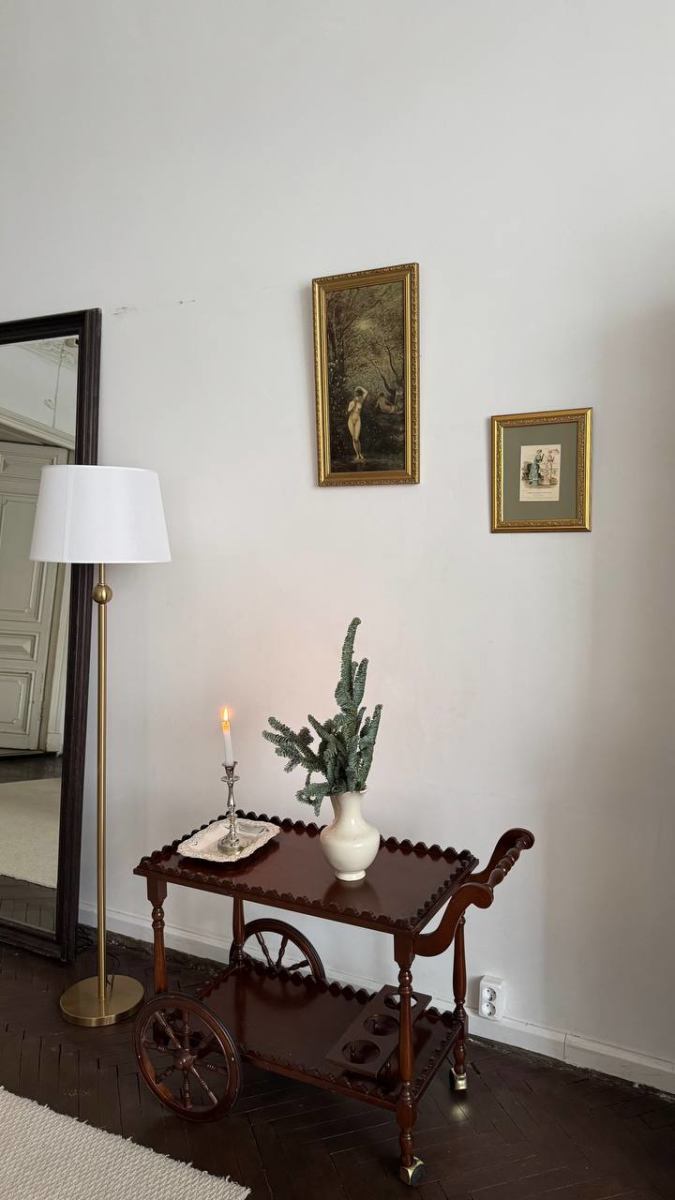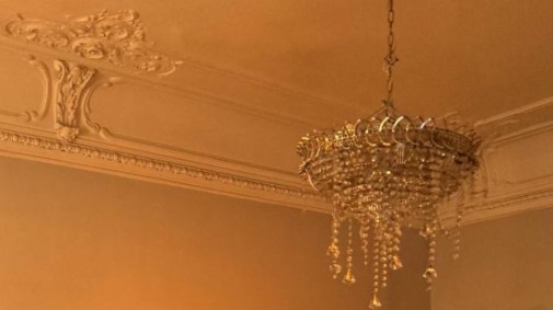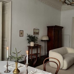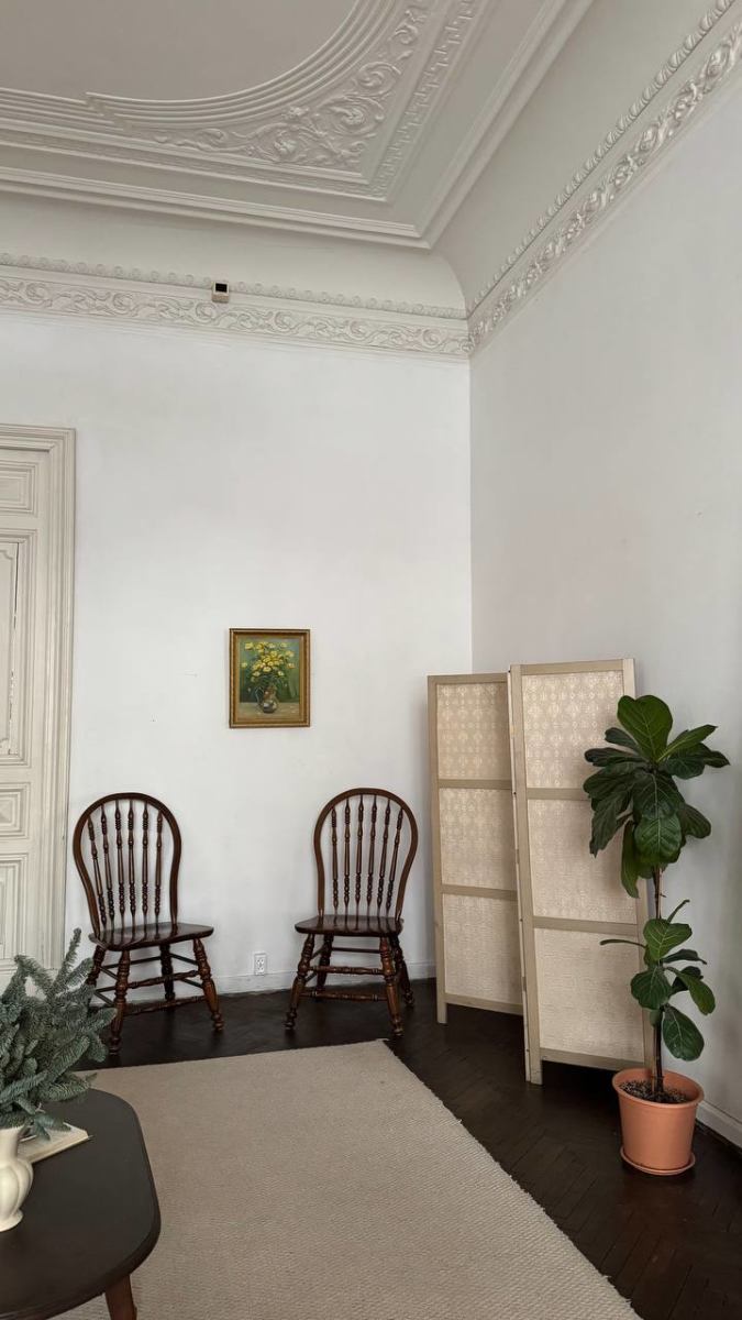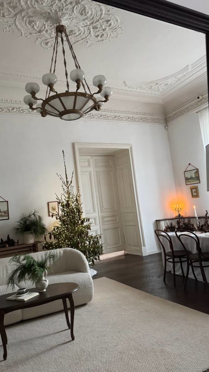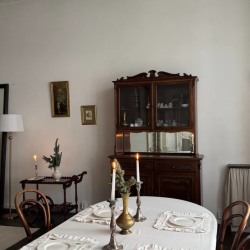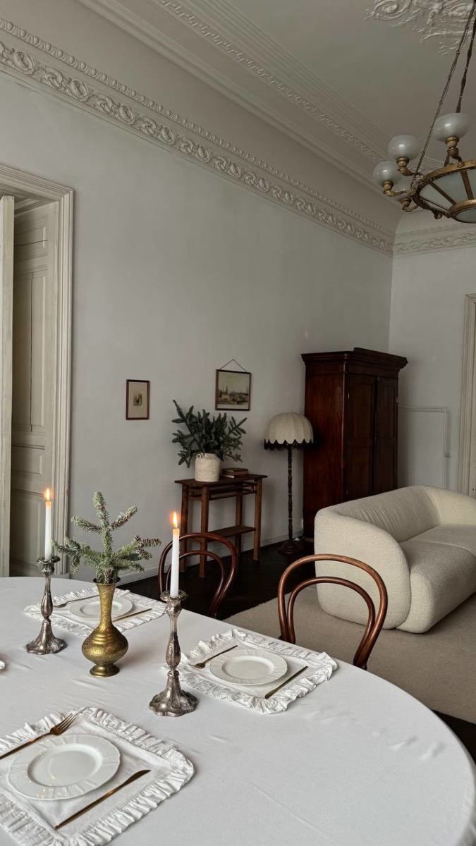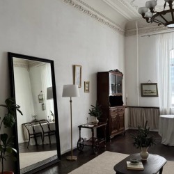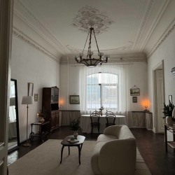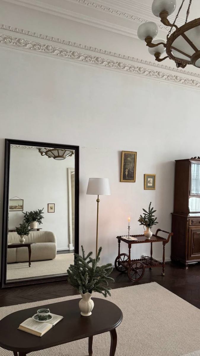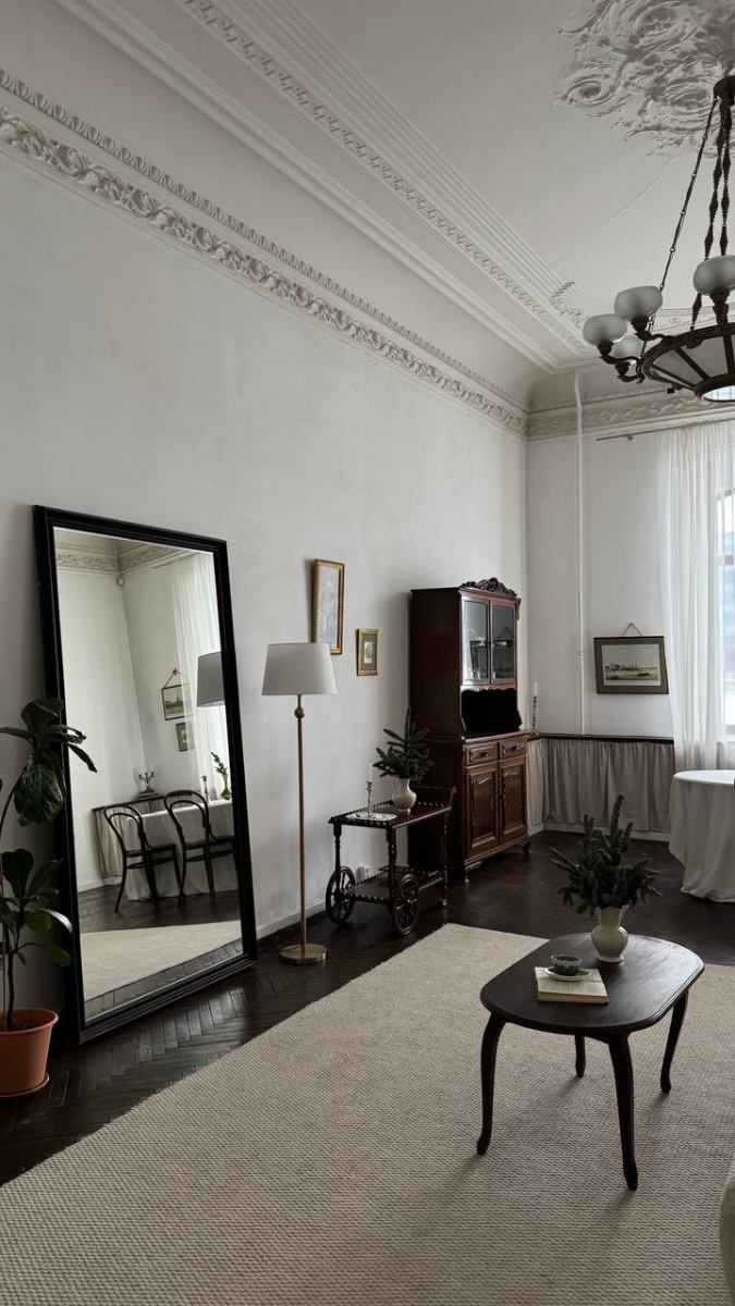 Элегантная гостиная с роскошной исторической люстрой и лепниной, дореволюционным паркетом и видом на Неву наполнена духом старинных европейских квартир и Английских загородных особняков. По середине зала на полотне уютного ковра расположен современный диван с журнальным столиком, а рядом с большим, нет, с огромным окном и напротив анфиладной двери стоит антикварный буфет и большой овальный стол.