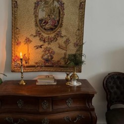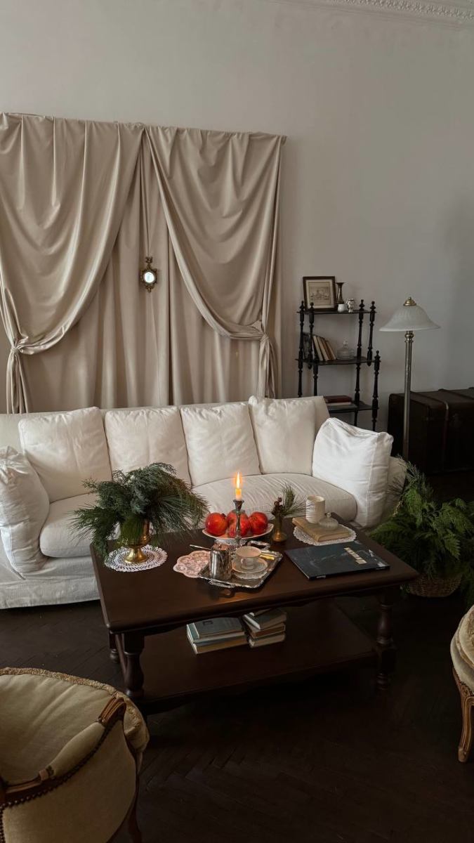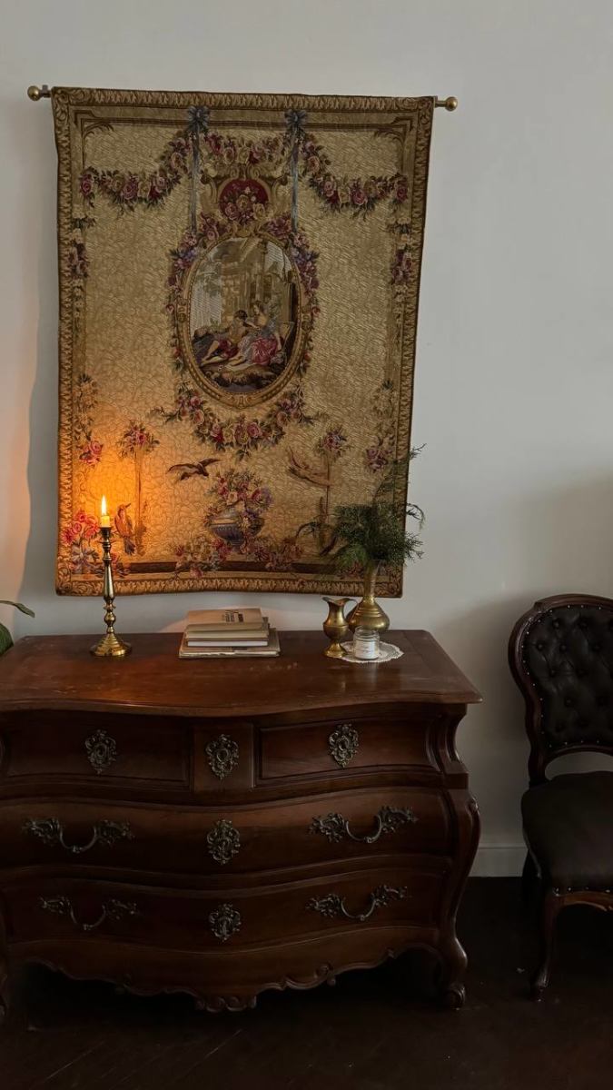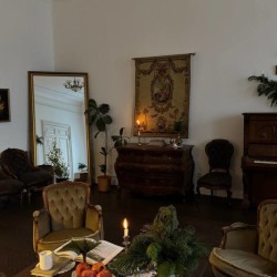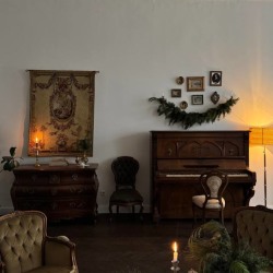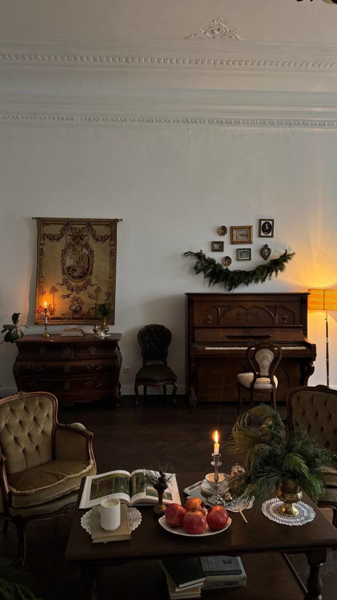 Элегантная кровать с балдахином, камин с ажурной гипсовой короной, антикварные шкаф и фортепиано с галереей фотокарточек над ним, диван и гобелен с французской вышивкой и другие детали, создающие уют и атмосферу.