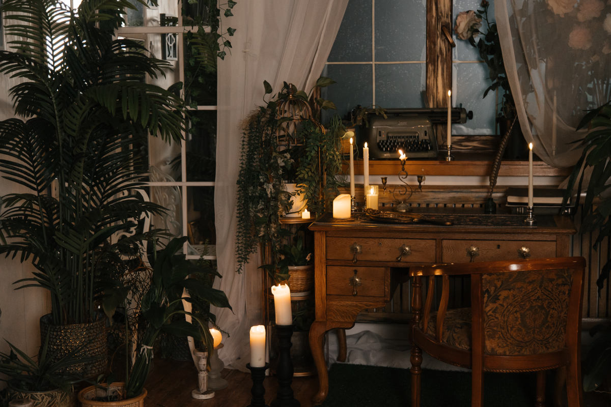 Есть также зона кабинета, с антикварным рабочим столом. Возможно принести из других залов разные диваны, в том числе кушетку антиквартную из красного бархата.
