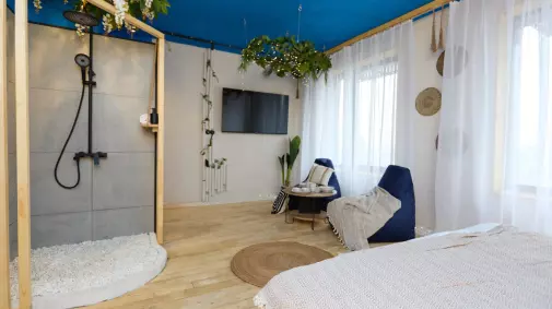ПОЧЕМУ ЭТО ТОП? Дикий интерьер: Натуральное дерево, галька под ногами, живые кактусы, стволы деревьев на потолке и яркие неоновые акценты. Вид, который продаст твой Инстаграм: Закаты над рекой и огни небоскребов — идеальный фон для Reels и TikTok. Пространство для движa: 40 м² чистого стиля. Вместимость до 12−15 человек (идеально для ДР, девичника, съемки клипа или камерной вечеринки). Фишки: Огромный ТВ, деревянная кухня-бар, уникальная световая инсталляция «ствол дерева» и гирлянды, создающие магию ночью .