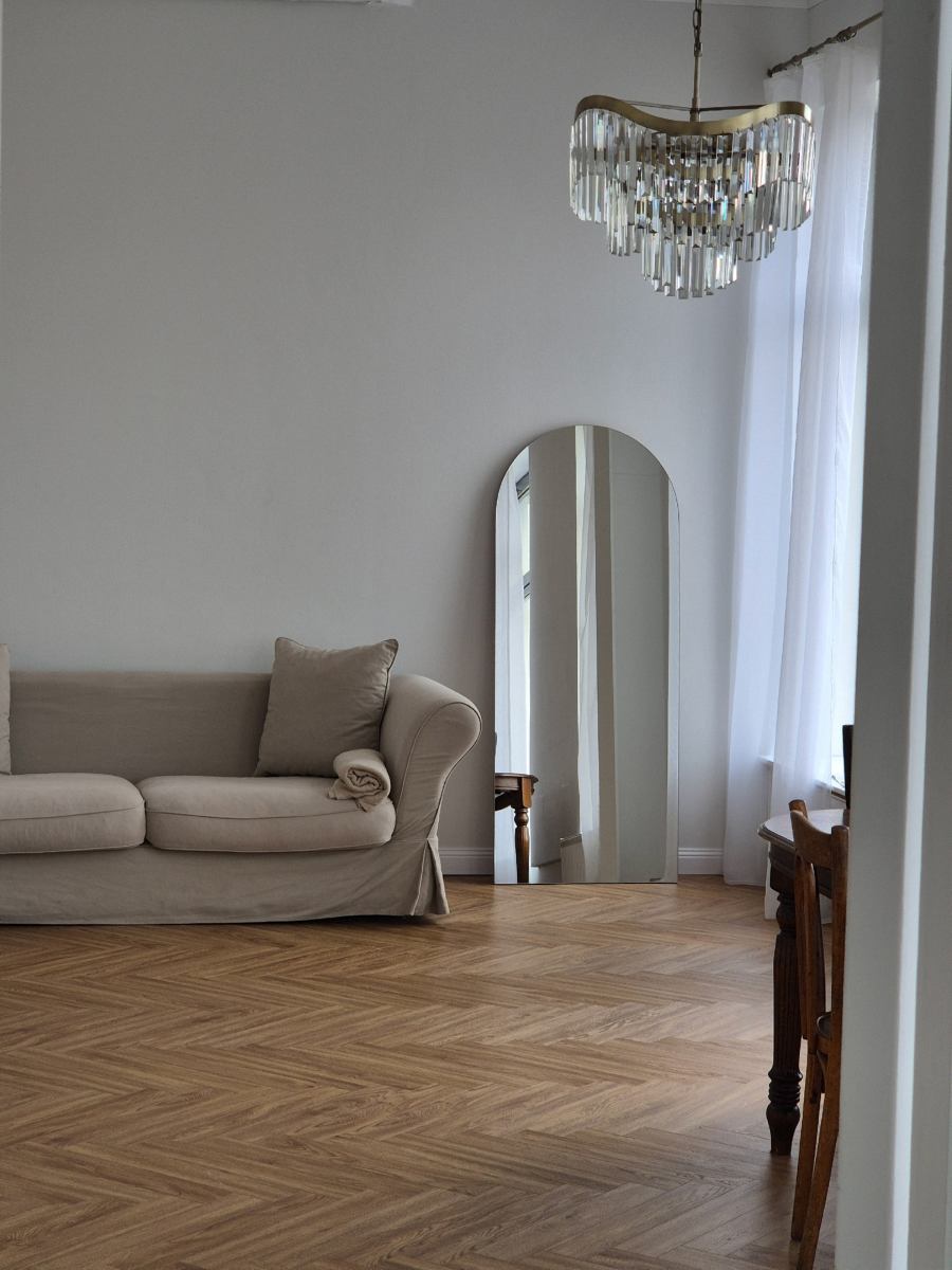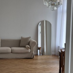 Большие распашные двери из сталинки, винтажная мебель, 3 больших окна, высокие потолки, много воздуха. Вся мебель на колесах передвигается. Прямые солнечные лучи входят в зал в 14:30 и остаются до заката. Находится в Сергиевом Посаде