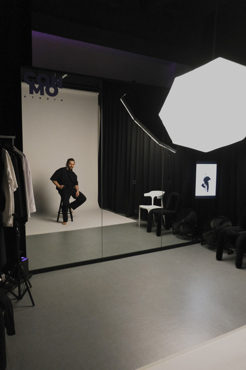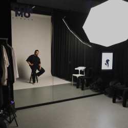 В студии на выбор белый или черный фон, установлен студийный свет, а за зеркалом настроен профессиональный фотоаппарат.