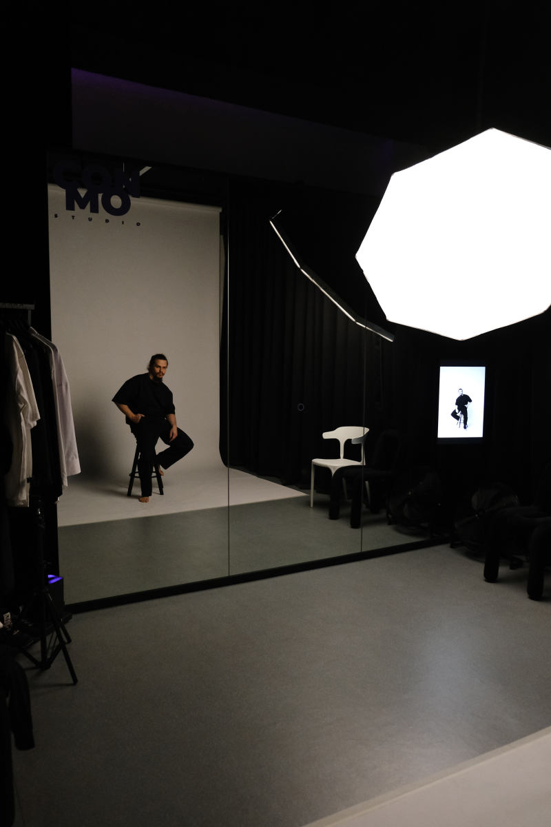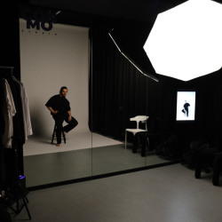 В студии на выбор белый или черный фон, установлен студийный свет, а за зеркалом настроен профессиональный фотоаппарат.