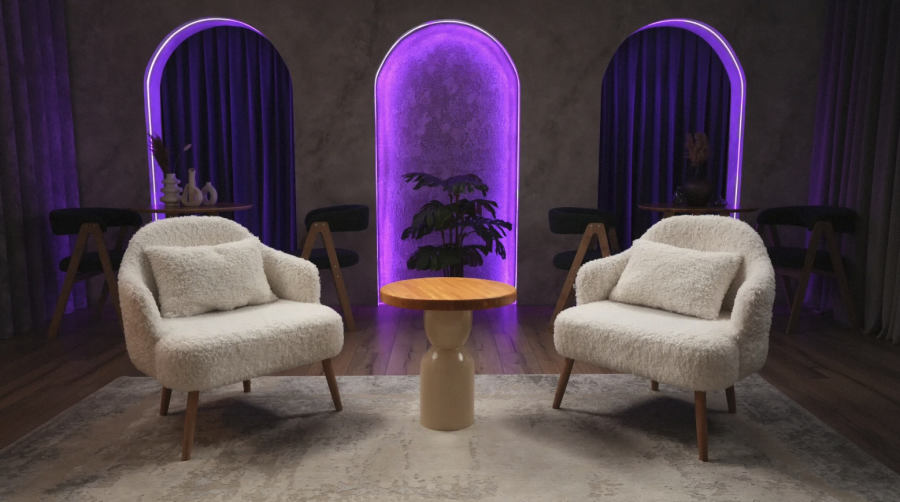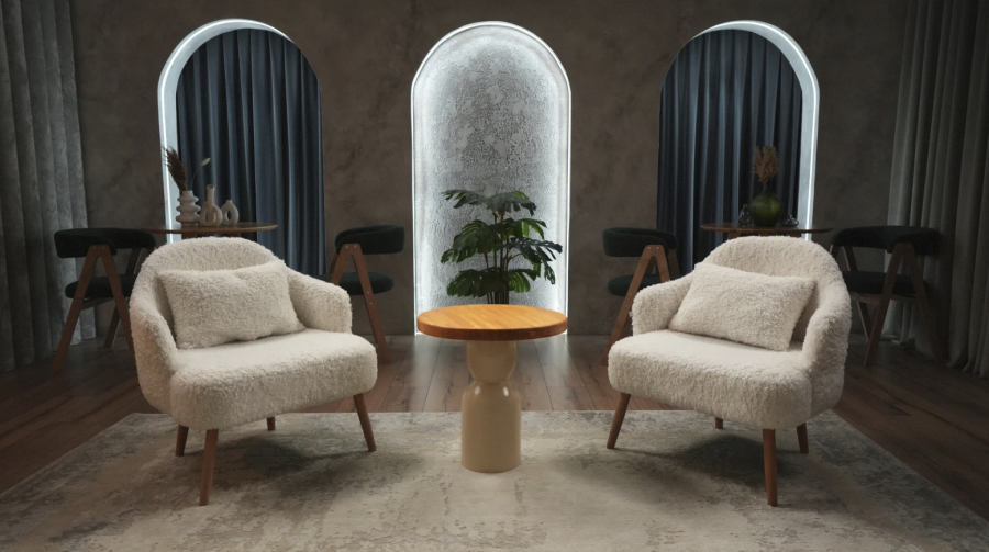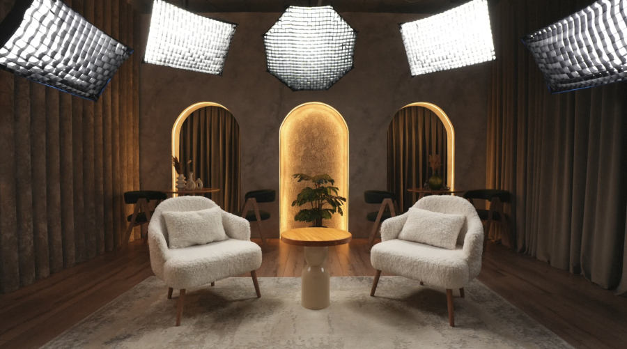 Зал 3: Кафе (35 м²) светлое и уютное пространство в бежевых тонах с арками, шторами и атмосферой европейского кафе. Идеально для уютных подкастов и блогерского контента.