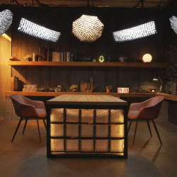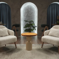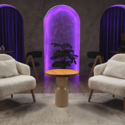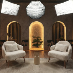 Зал 2: Лофт (40 м²) стильный индустриальный интерьер с бетонными стенами, деревянными акцентами и мягким светом. Отличный вариант для темных подкастов и деловых интервью.