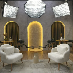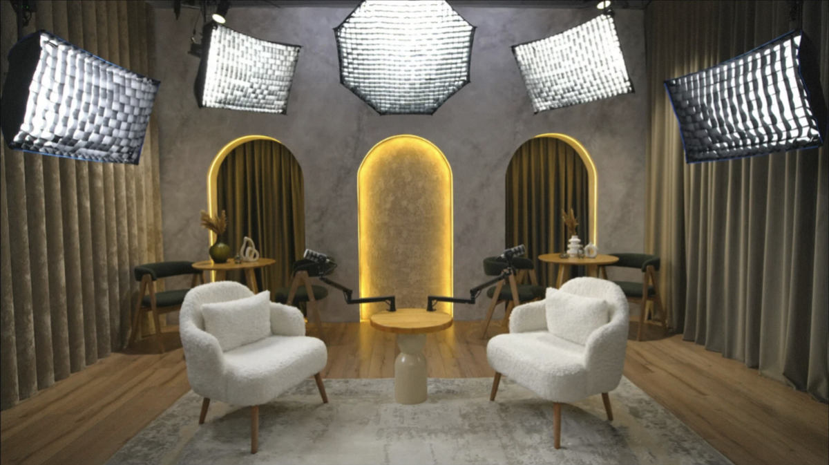 Зал Cafe (35 м²) — светлая и тёплая локация в бежевых тонах с арочными проёмами, текстильными шторами и мебелью в стиле уютного европейского кафе. Атмосфера подходит для съемок подкастов, утренних сюжетов, искренних интервью и женских блогов.