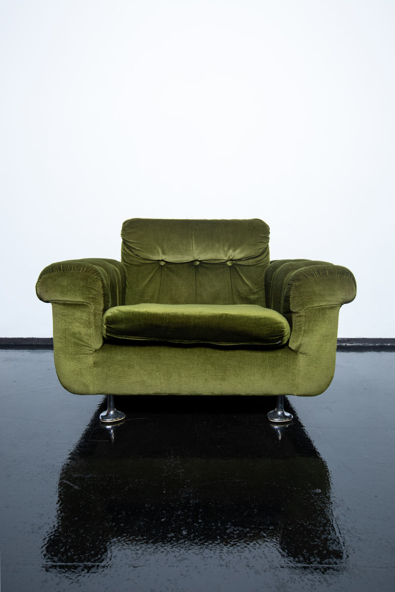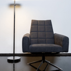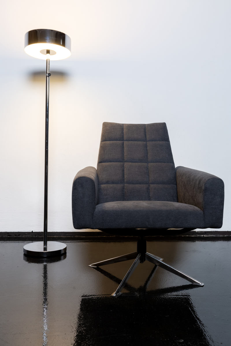 2. Элегантное кресло болотного цвета дополненное торшером в пол в стиле минимализм