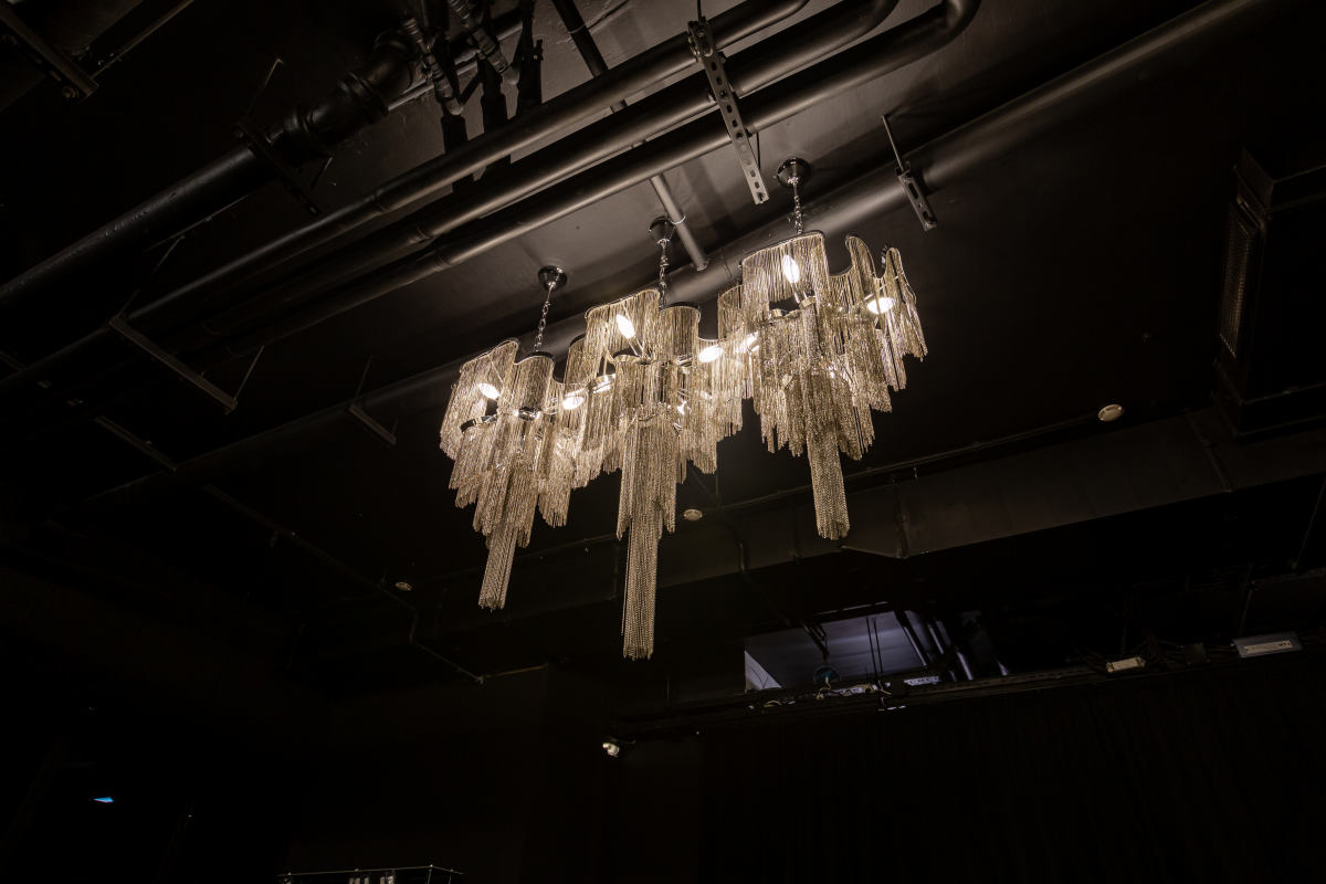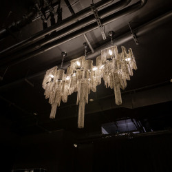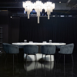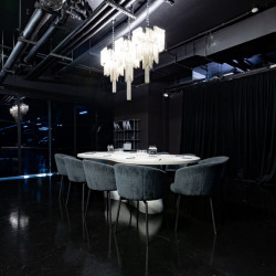 минимализм с двумя акцентными элементами в виде стола и люстры, комфортно будет компании до 12 человек