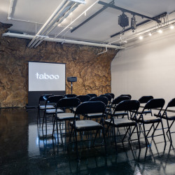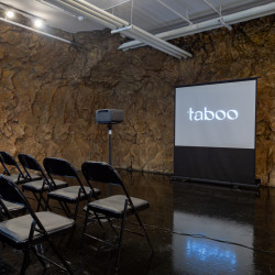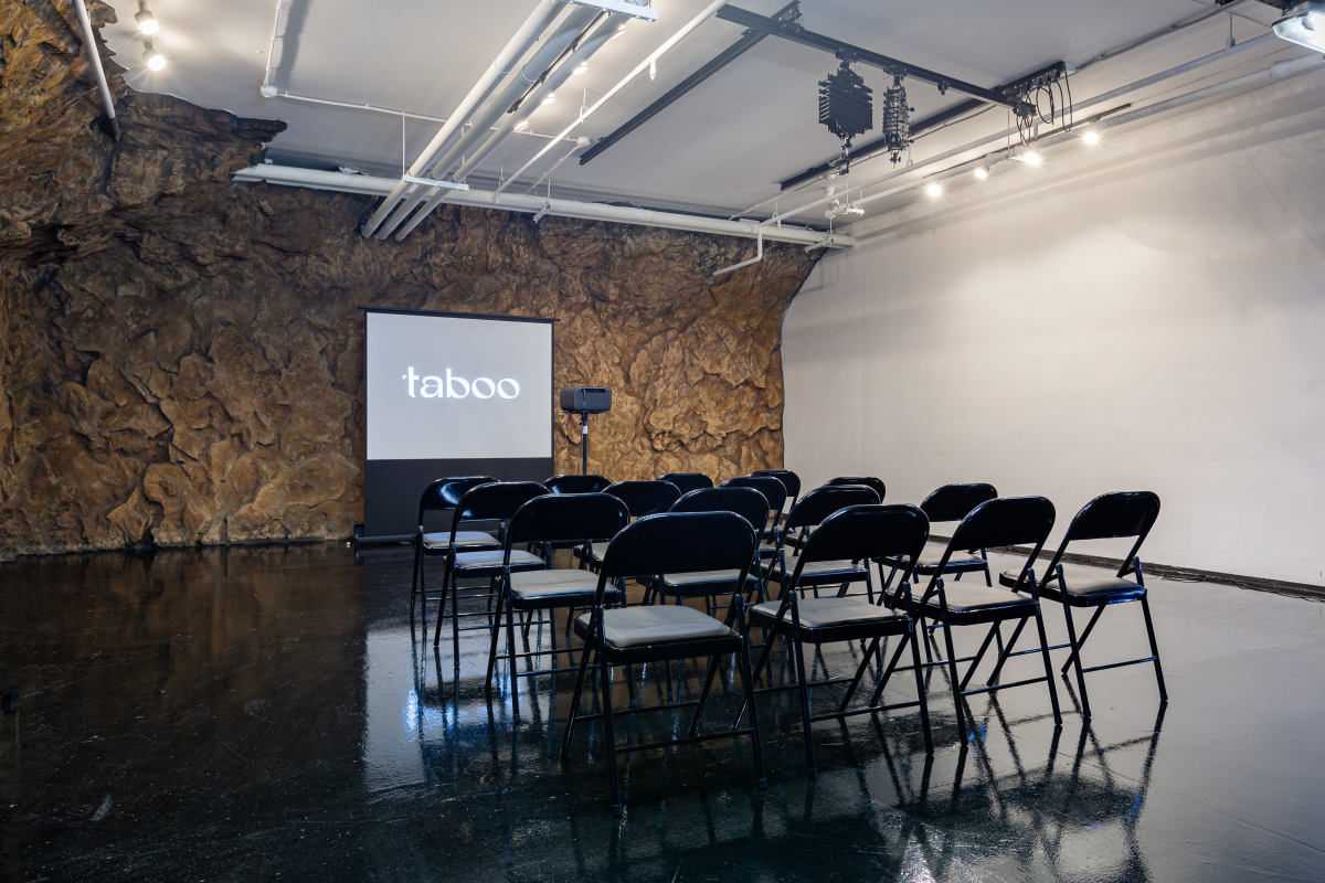 Зал с акцентным элементом в виде скалы во всю стену, дизайнерское решение для ваших красивых мероприятий, рассчитанных с комфортной вместительностью до 40 человек