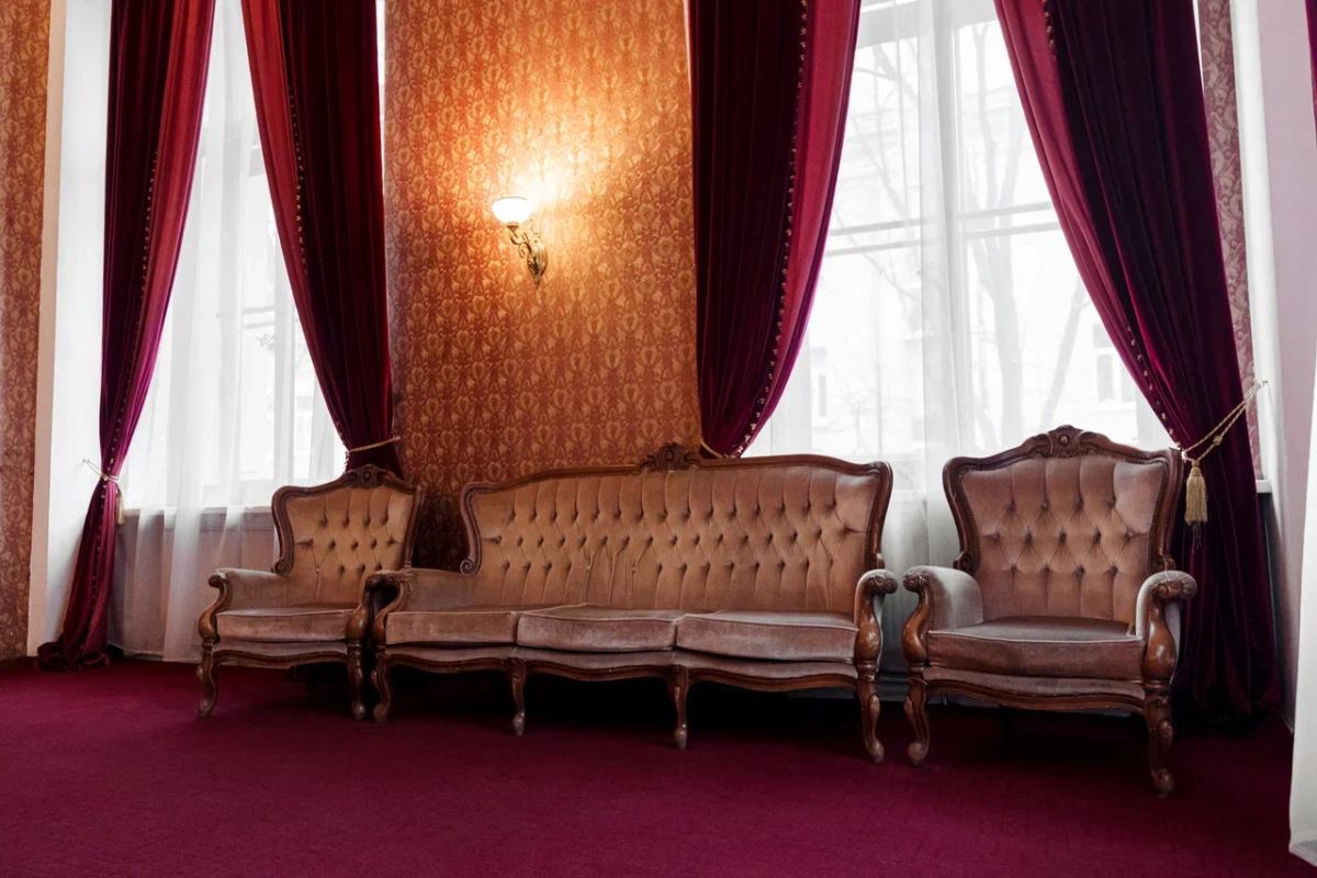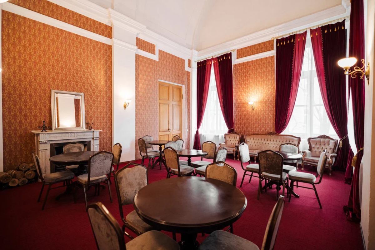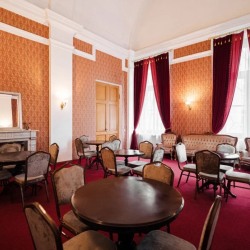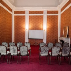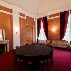 Уютный зал, который идеально подходит для мероприятий с небольшим количеством гостей, где создается камерная атмосфера. Мягкая мебель в антикварном стиле, большой круглый стол и обои с оригинальным орнаментом придают этому залу особый шарм, а старинный камин оригинально дополняет весь интерьер.