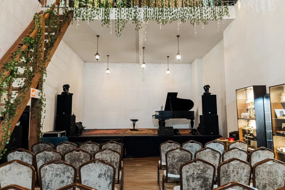 В зале гармонично сочетается стиль и камерная атмосфера. Стены, цвета слоновой кости и большие окна делают его светлым и уютным. Зал оборудован собственной сценой. Особый шарм ему придают антуражная лестница и оригинальная кирпичная кладка на потолке, сохраняющая исторический характер пространства.