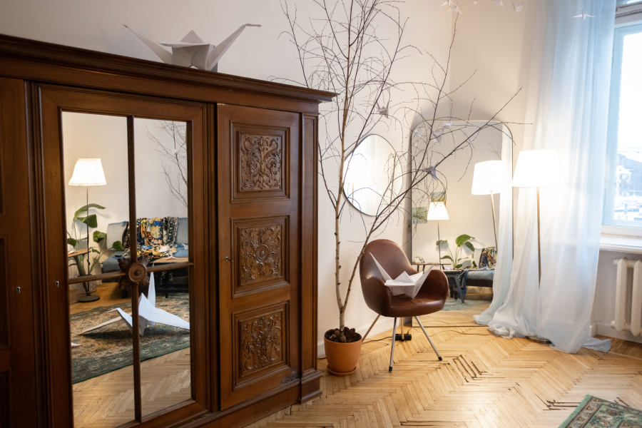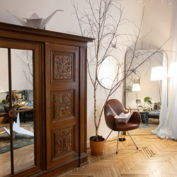 Светлая комната с винтажной мебелью, люстрой, большим зеркалом и креслами. Отлично подойдёт для уютных