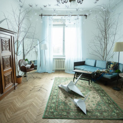 Пол из натуральной ёлочки, мягкий ковёр, дизайнерские кресла в интерьере создают пространство, в котором хочется остаться.
