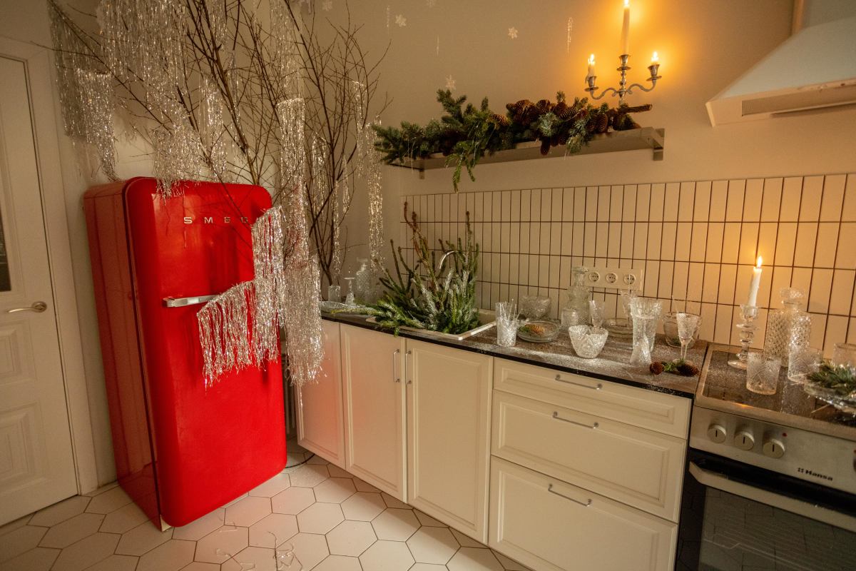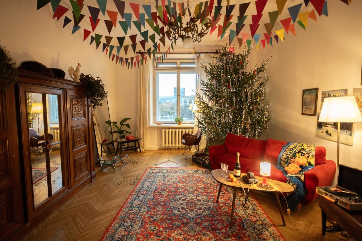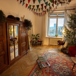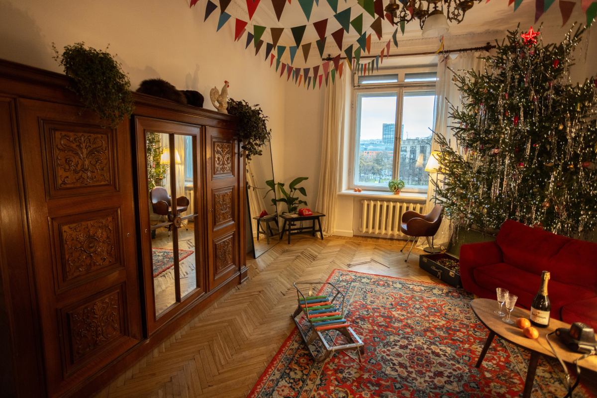 Светлая комната с винтажной мебелью, люстрой, большим зеркалом и креслами. Отлично подойдёт для уютных