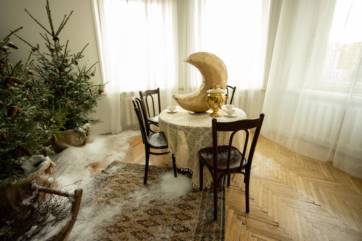 Классическая столовая в стиле русской усадьбы: антикварный буфет, старинные стулья, круглый стол с цветами, высокие окна и часы с боем. Вторая часть зала — просторное помещение с большим зеркалом и мягким светом. Атмосфера утреннего чаепития, старомосковского дворянского уюта и европейского шарма.