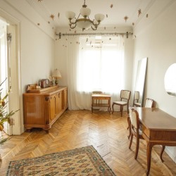 Пространство из двух соединённых комнат — больше, чем просто интерьер. Это возможность создать разнообразные кадры без смены локаций. Зал оформлен в духе светлой европейской квартиры начала XX века: антикварная мебель, лепнина на потолках, высокие окна с лёгкими шторами и тёплый паркет «ёлочкой».