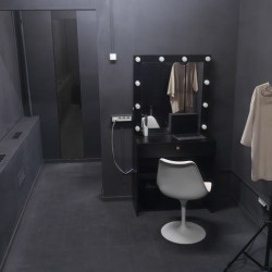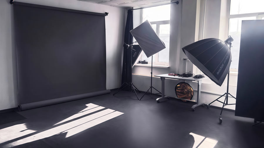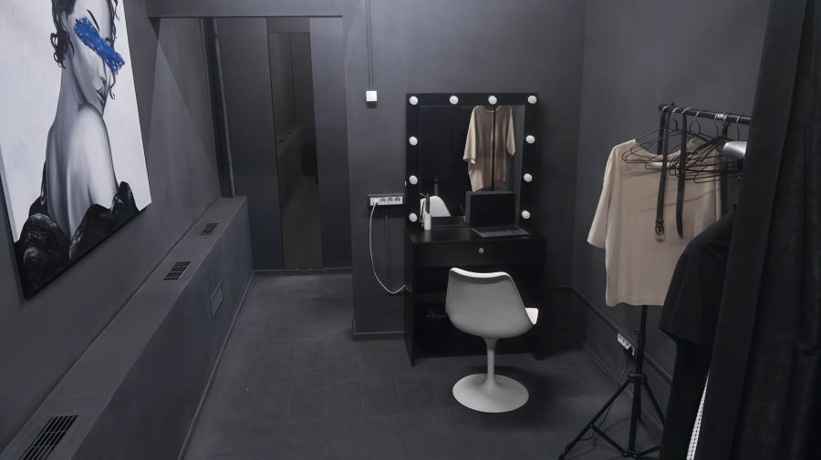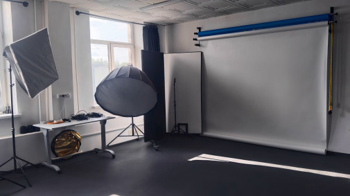 Студия состоит из съёмочного зала 35м² и гримёрки 15м². У входа в студию есть небольшая зона ожидания с мягким диваном, вешалкой для одежды, чтобы клиет или команда, приехавшая заранее, могла отдохнуть перед предстоящей работой.