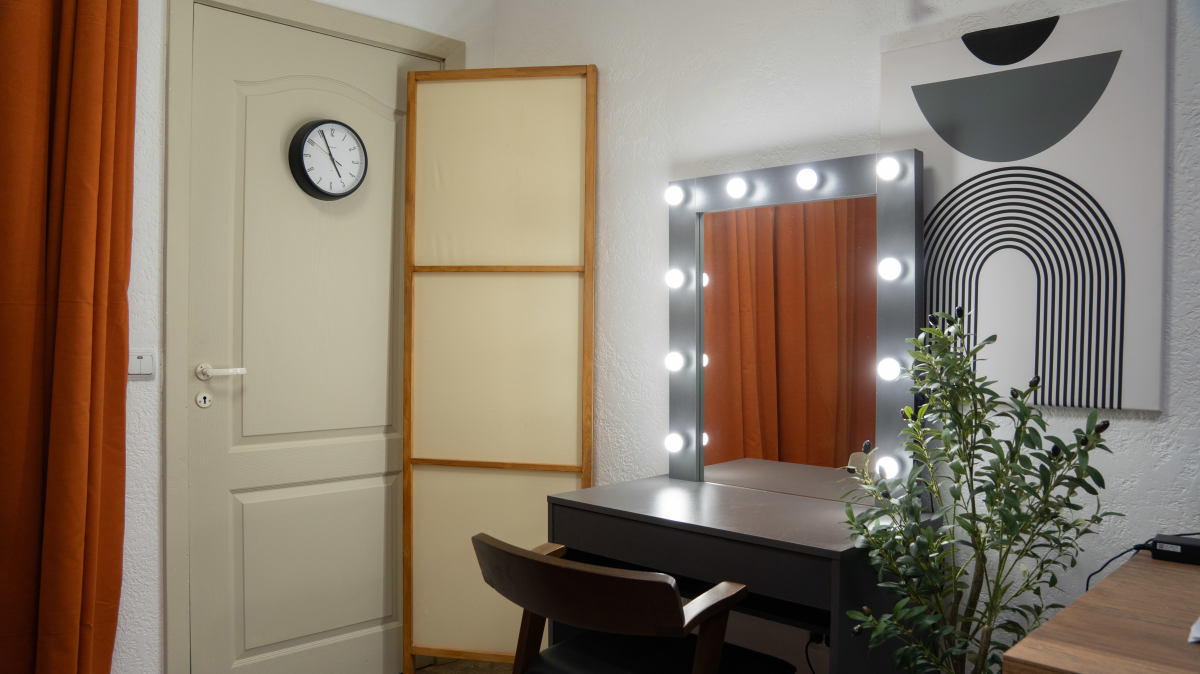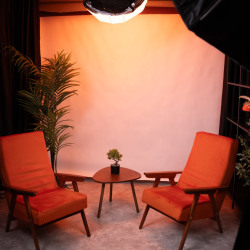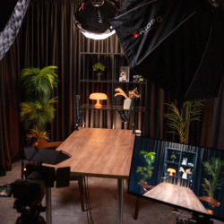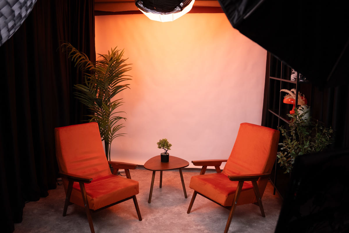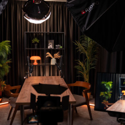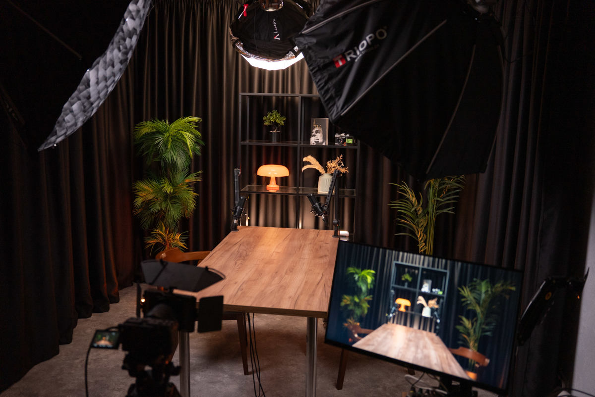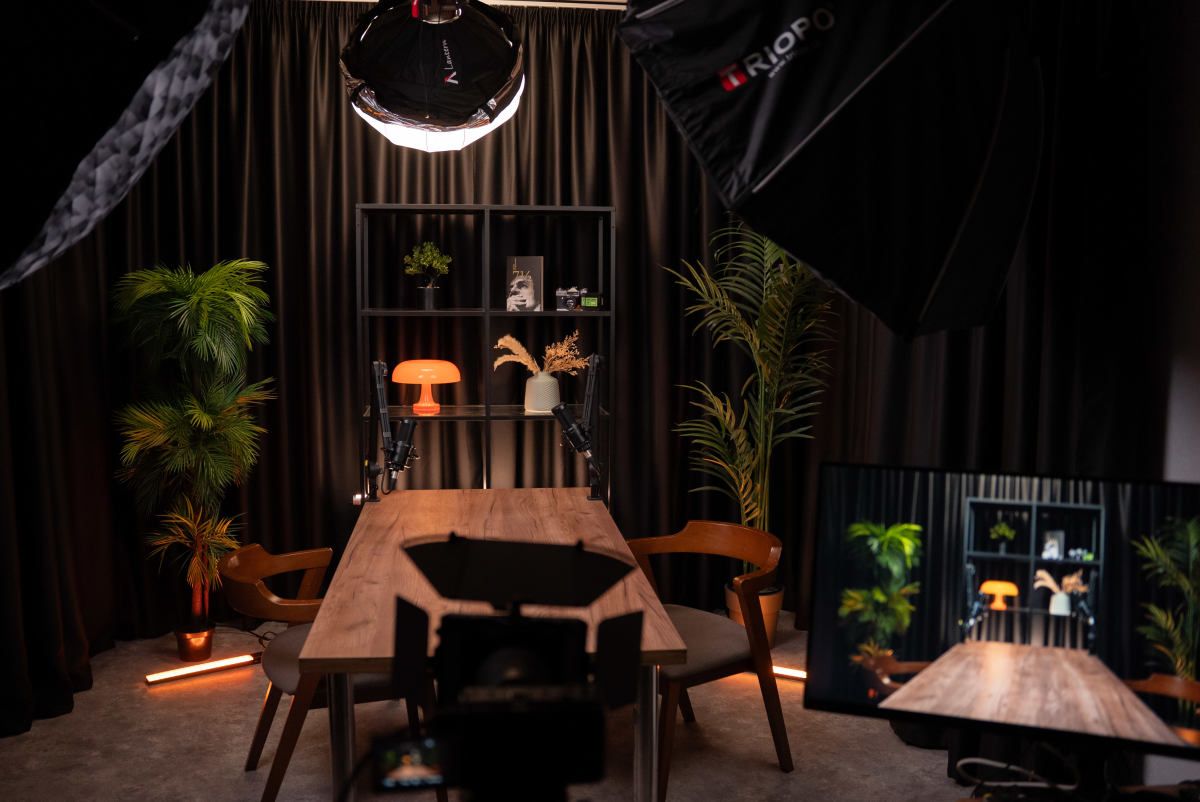 Студия оснащена профессиональным видеосветом, мебелью и реквизитом, что позволяет быстро менять стили: от домашнего уюта до строгой деловой атмосферы.