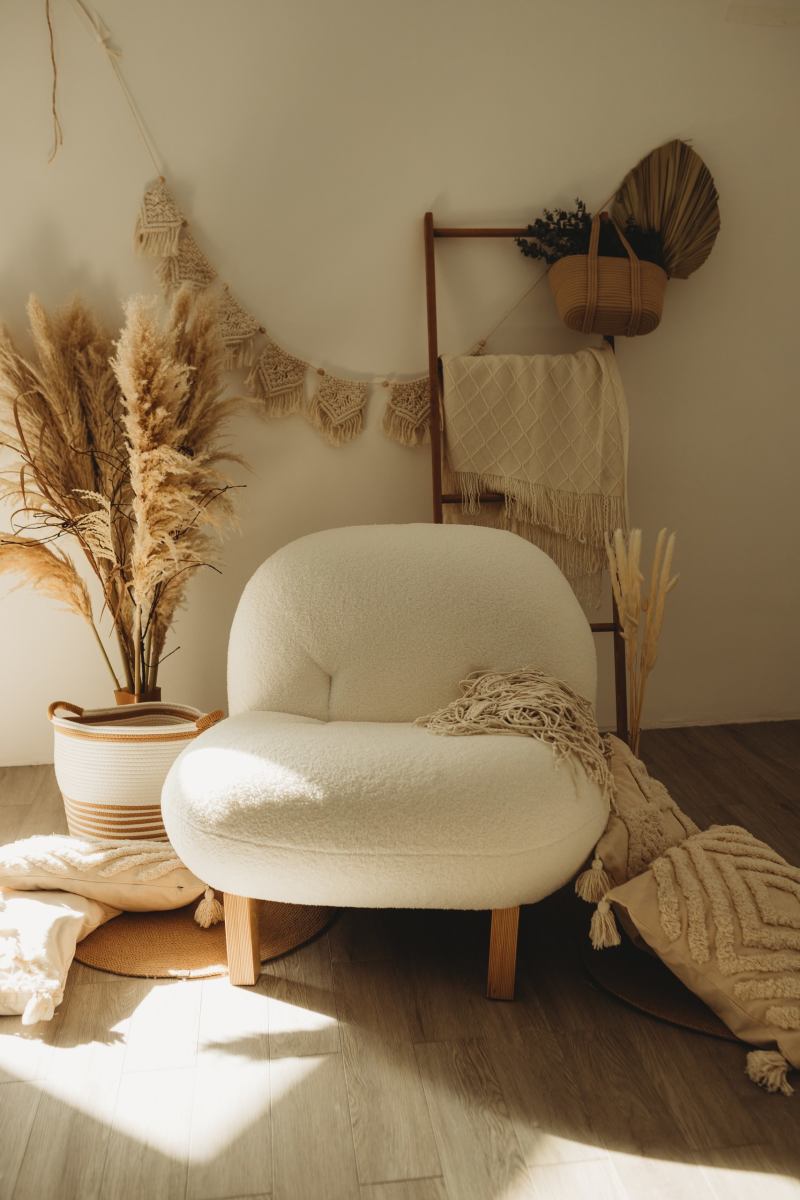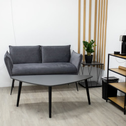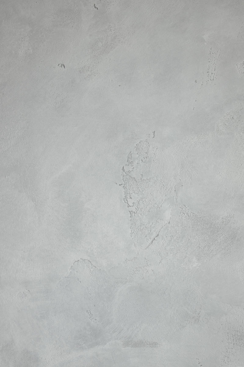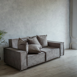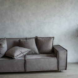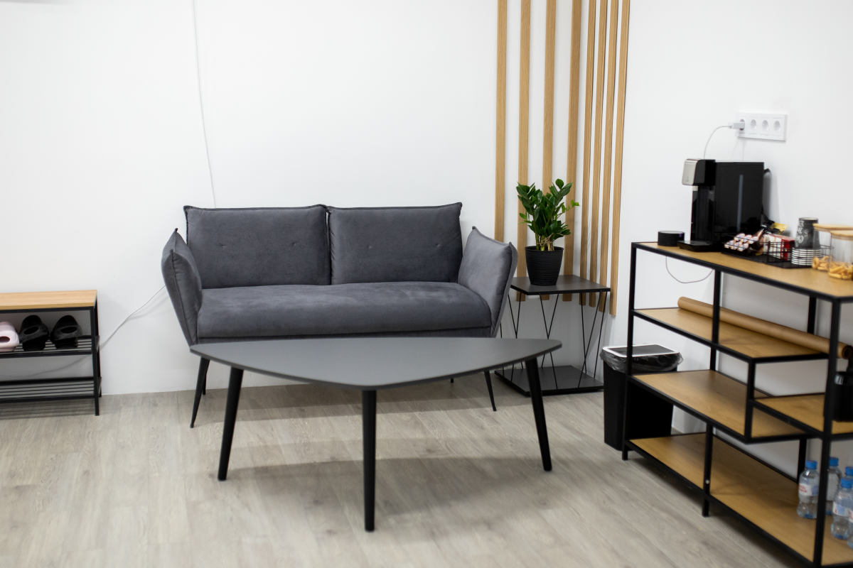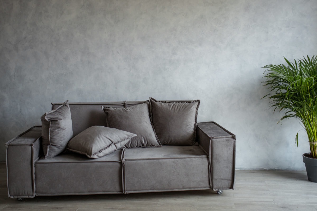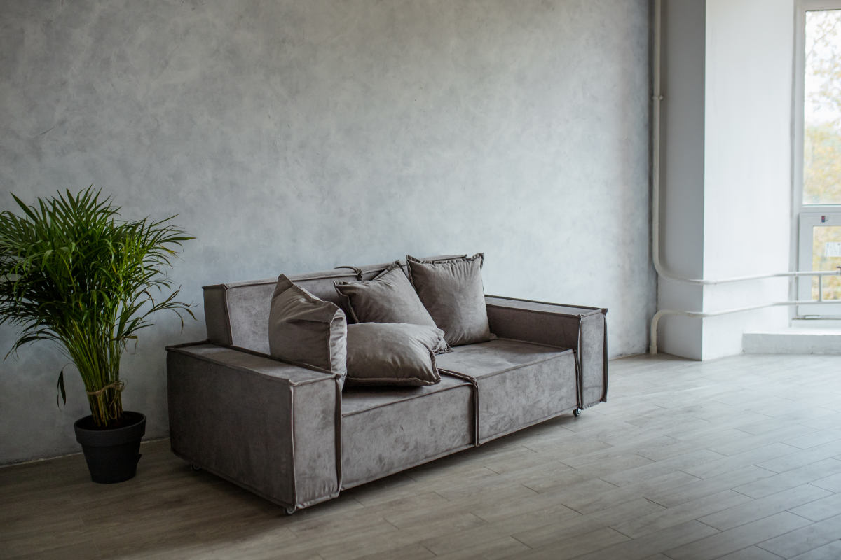 В интерьерной части зала есть большой серый диван и бетонная стена, белое