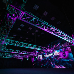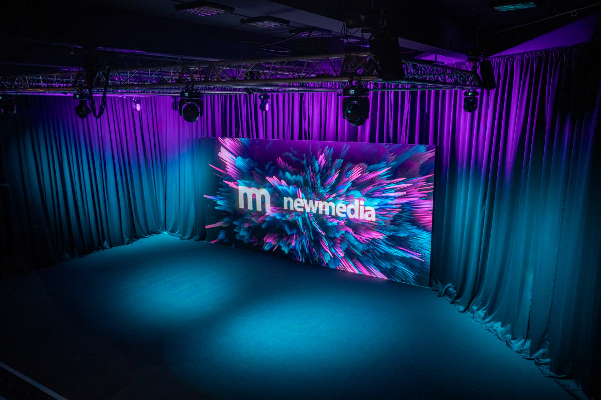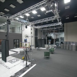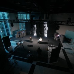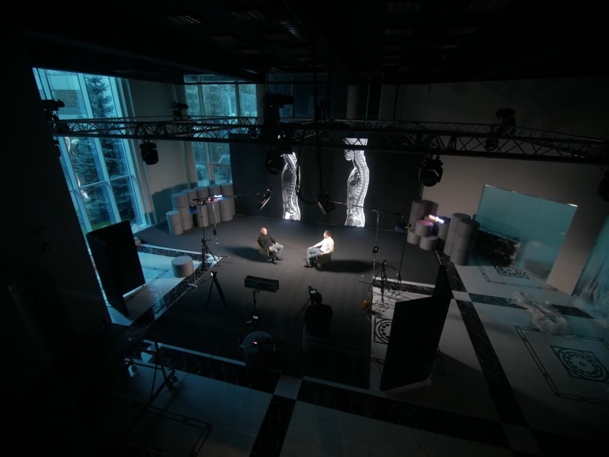 Съёмка в павилионе 200 м2. Павилион оборудован большим экраном с управлением с компьютера, подвесной фермой на электролебёдках, на которой размещены управляемые RGB софиты, операционной комнатой с мониторингом звука и видео.