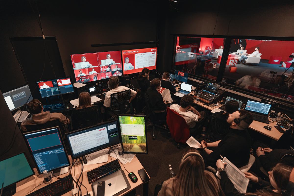 Подготовка павилиона к съёмке осуществляется нашей командой. Профессионалы настраивают освещение, подготавливают мебель в кадре, выставляют до пяти камер, ставят микрофоны, выводят на экран Ваш фон или подготавливают оригинальную графику по запросу. Вам остаётся только приехать к назначенному времени, переодеться в гримёрке и выйти под камеры.