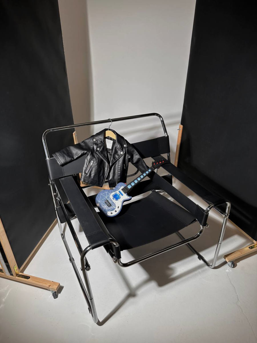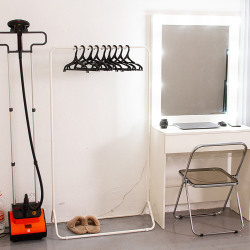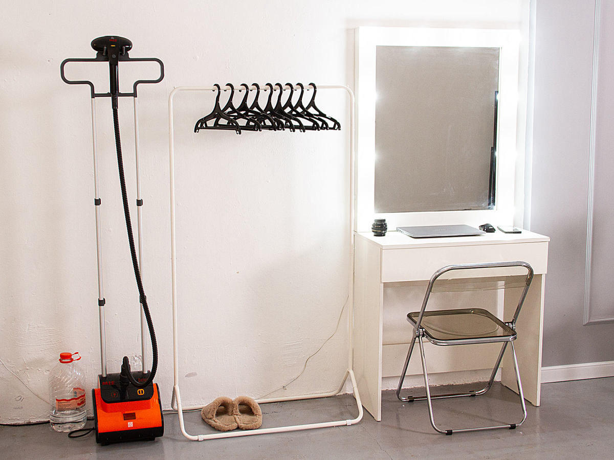 В студии есть диван, стулья, кресло, росторое зеркало, гримерный стол, рейл и мощный отпариватель.