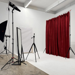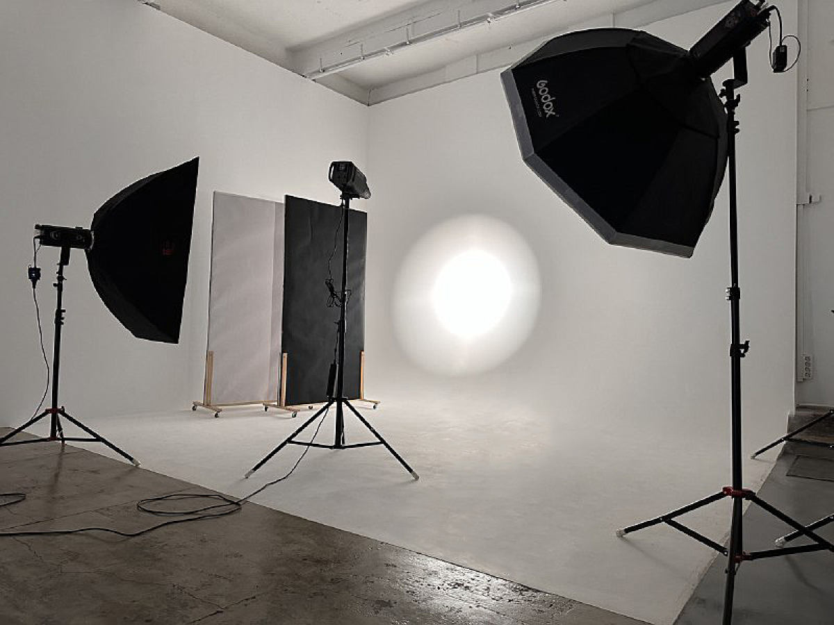 1. Белая циклорама 5 метров в ширину, вылет 4 метра, потолок 4 метра.