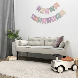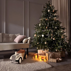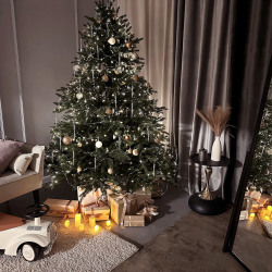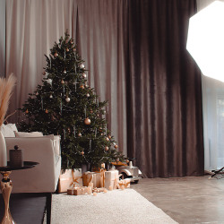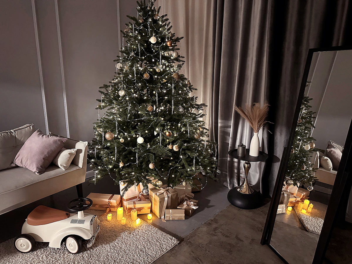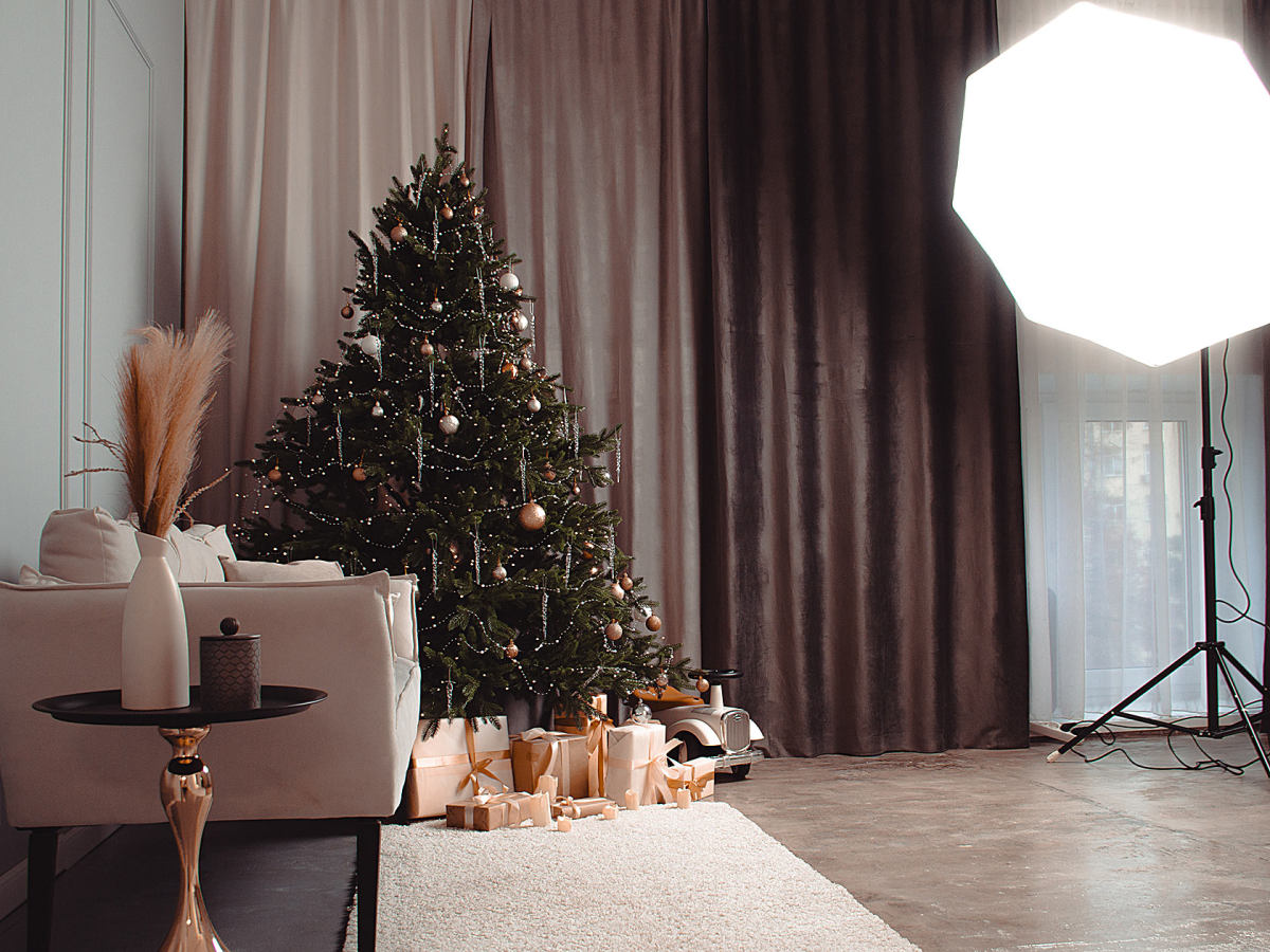 1. Новогодняя угловая фотозона с ёлкой, диванчиком, ковром, шторами, серой классической стеной с молдингом и праздничным декором.