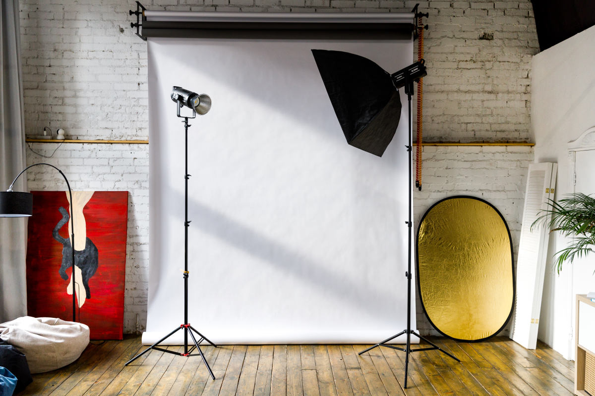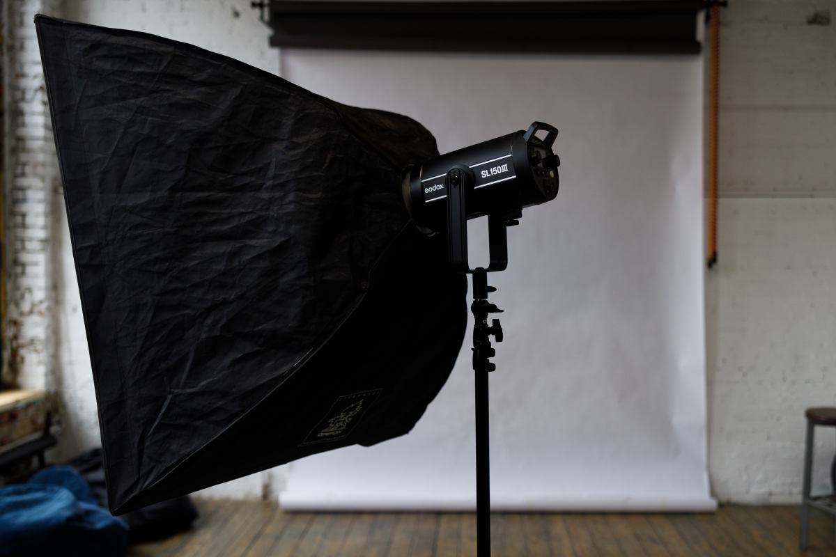 Из оборудования есть видеосвет Godox, импульсный моноблок Godox, разные насадки.