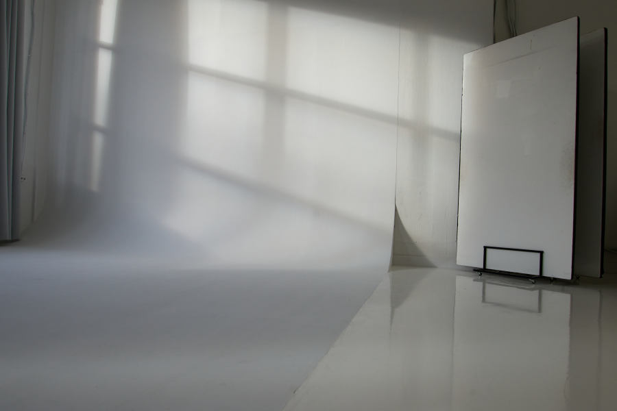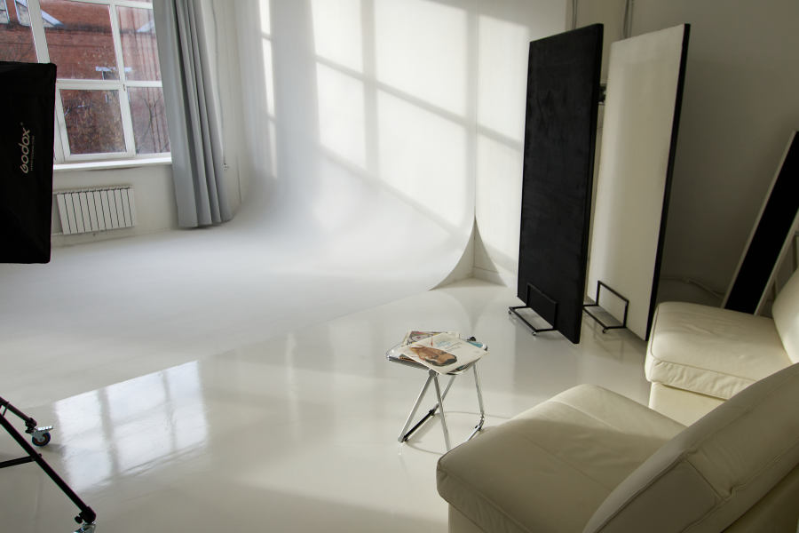 В центре студии — большая белая циклорама с аккуратными полуматовыми полами, которые дают мягкое отражение и идеально подходят для любых типов фотосессий.