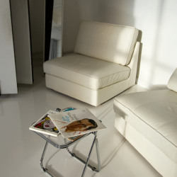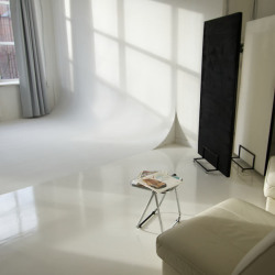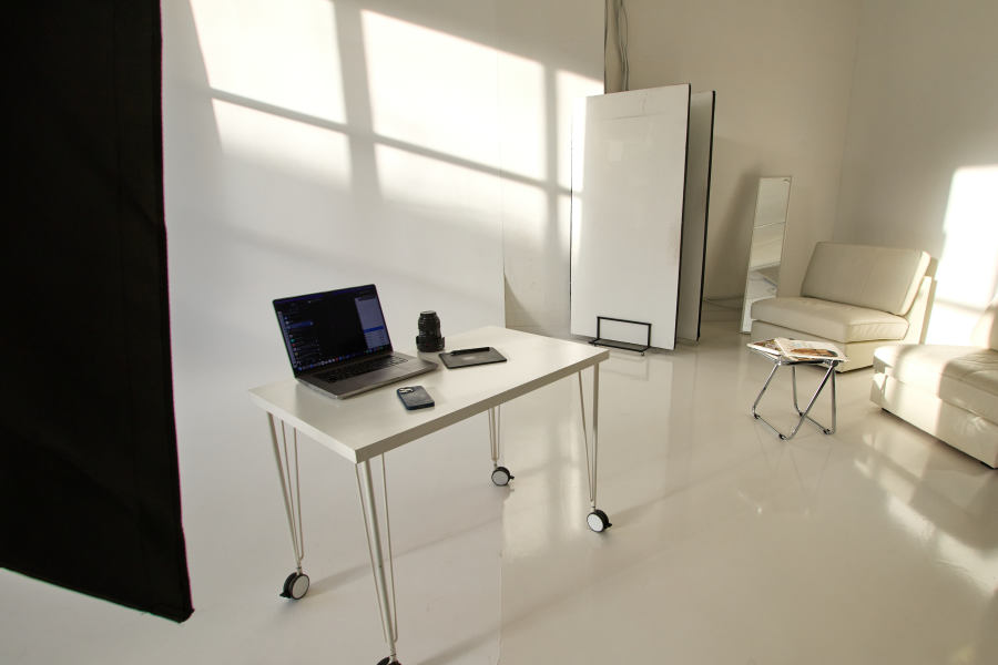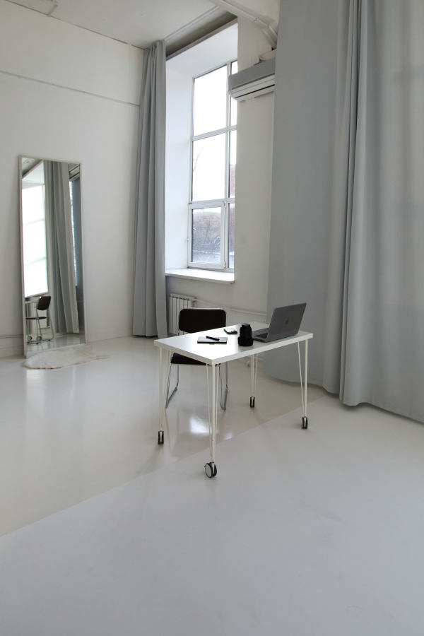 Пространство залито естественным солнечным светом: большие окна пропускают много дневного света, и солнечные лучи красиво ложатся на циклораму, создавая воздушную и живую атмосферу.