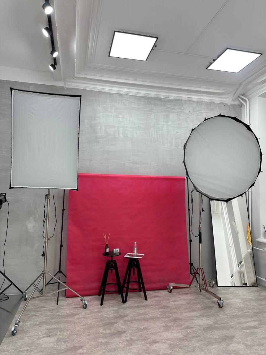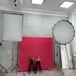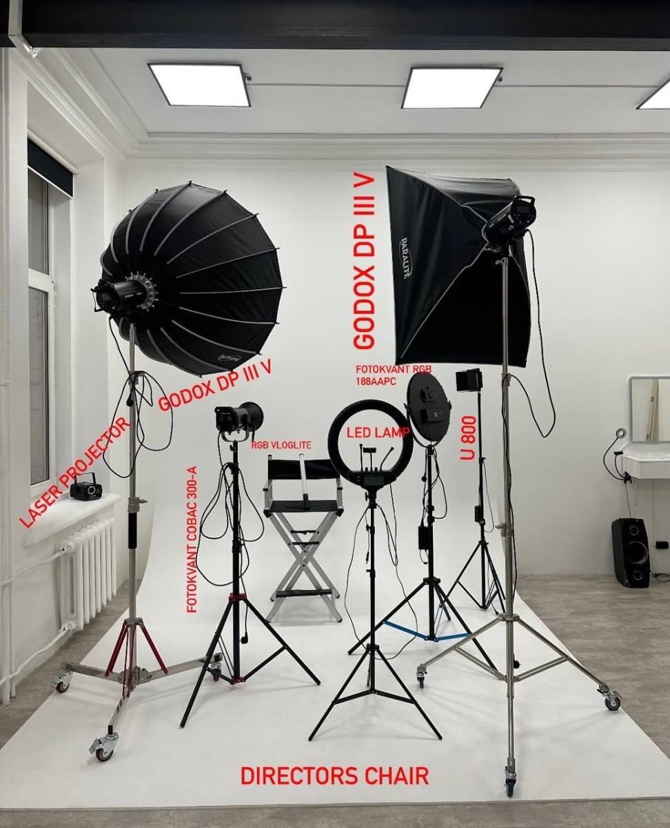 Зал оснащён профессиональным оборудованием: импульсный и постоянный свет, тканевые фоны, хромакей,