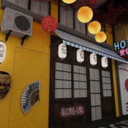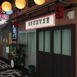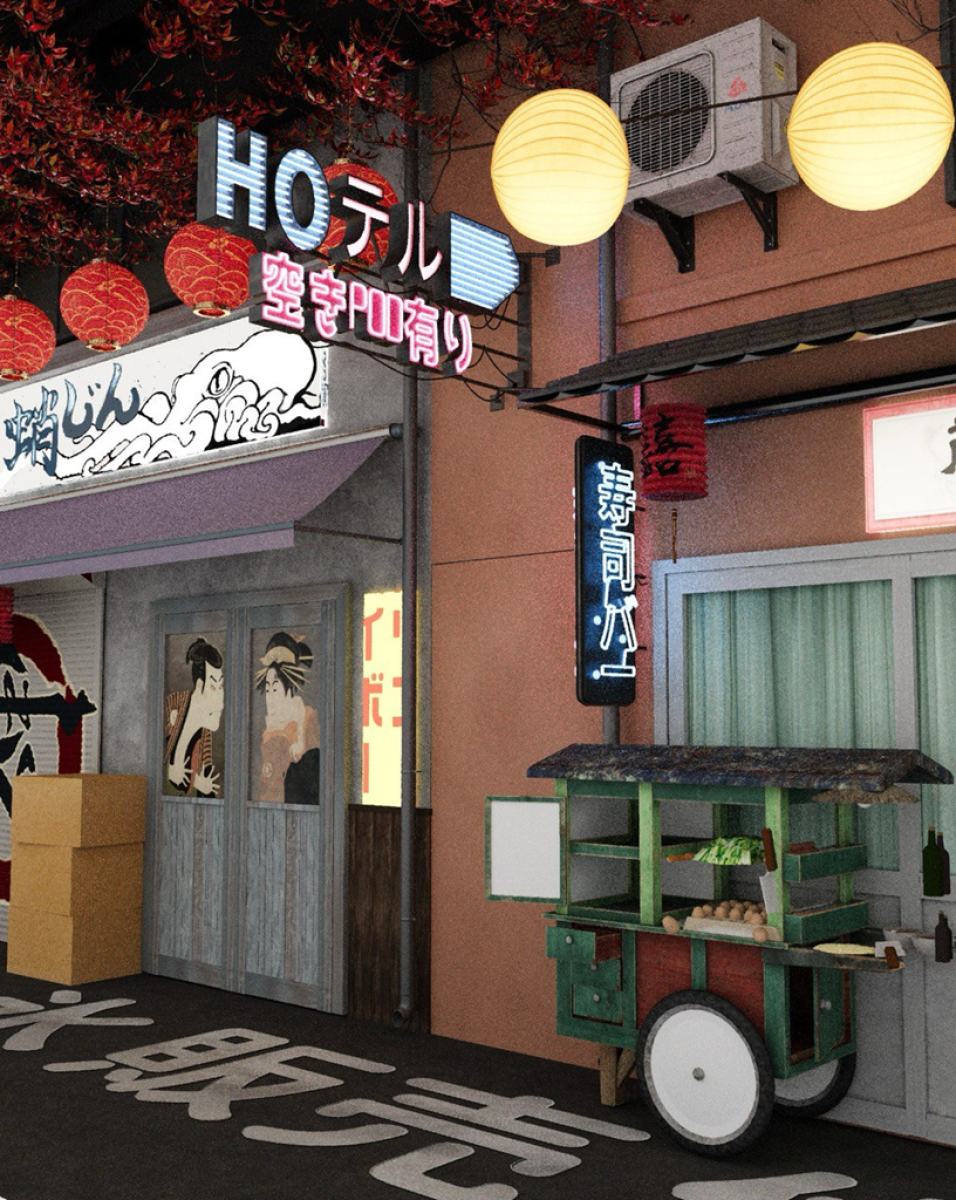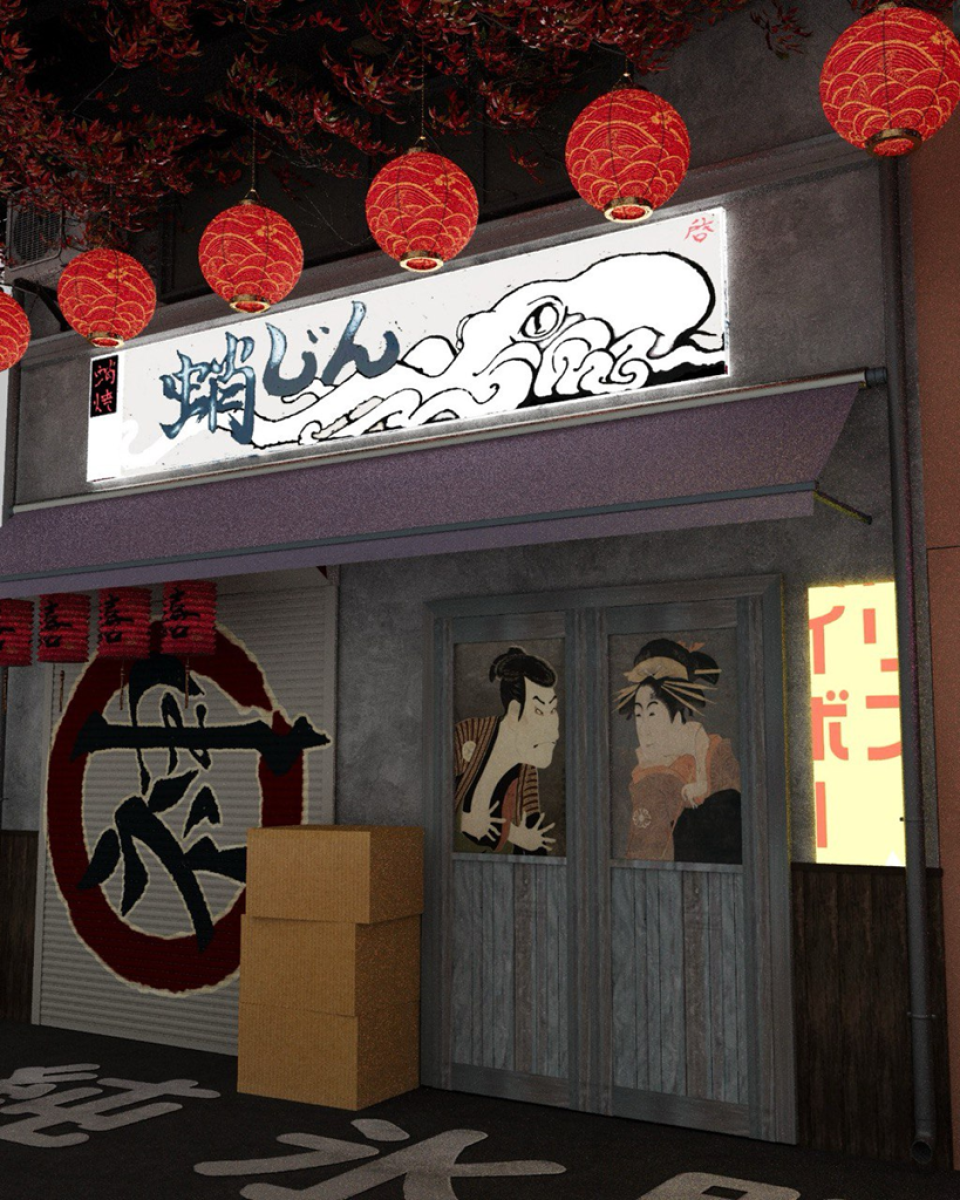 Узкий проход, неоновые таблички и детали на стенах делают пространство живым и очень фотогеничным. Студия отлично передаёт настроение вечернего Киото уютного и атмосферного.