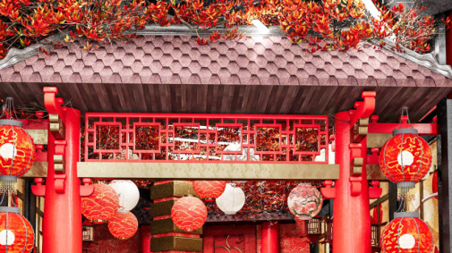Деревянные раздвижные двери, декоративные веера и уличные тележки создают атмосферу традиционного города.