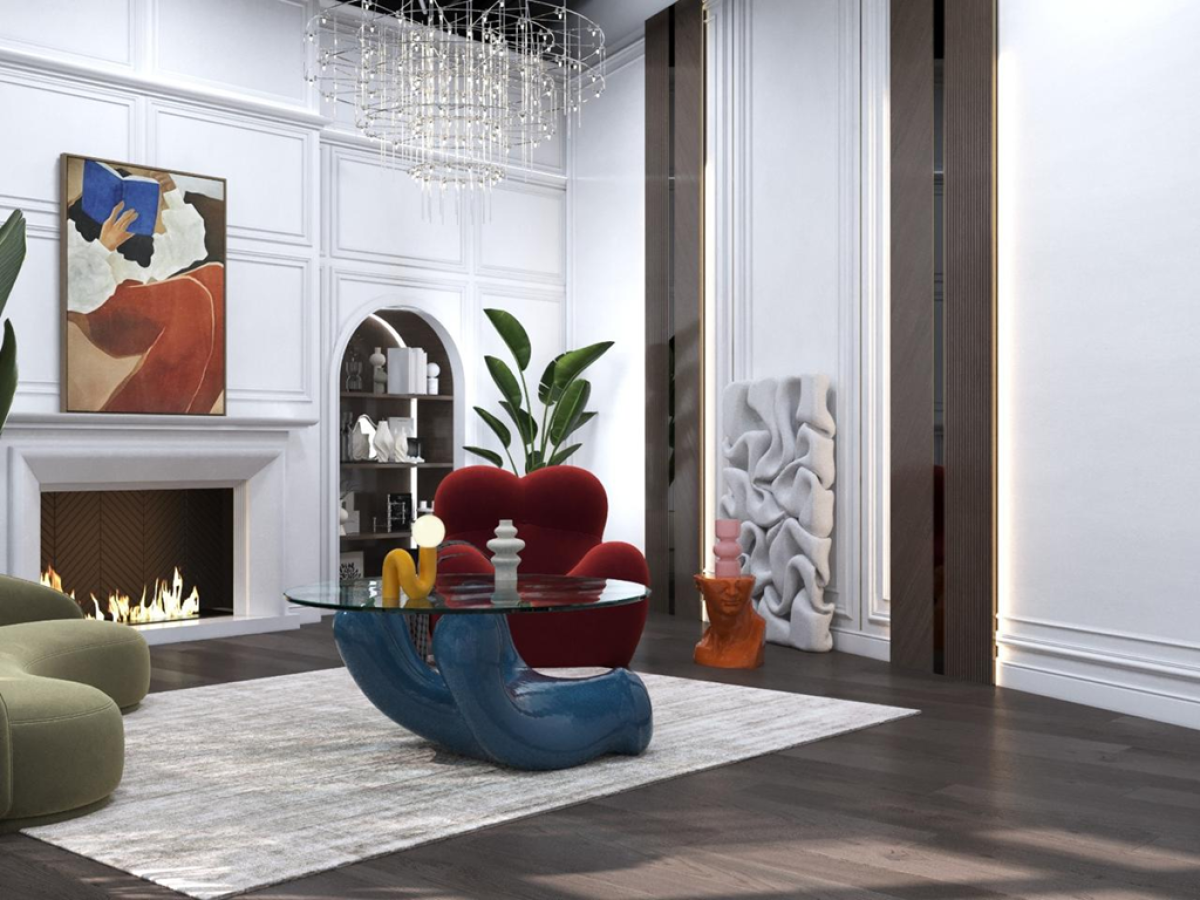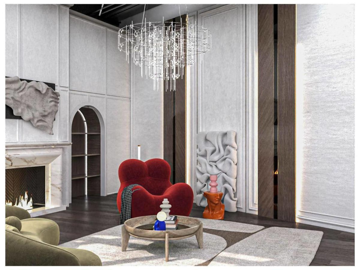 Белоснежные стены, украшенные молдингами, обрамляют камин изысканной лепниной, в котором уютно потрескивают дрова.