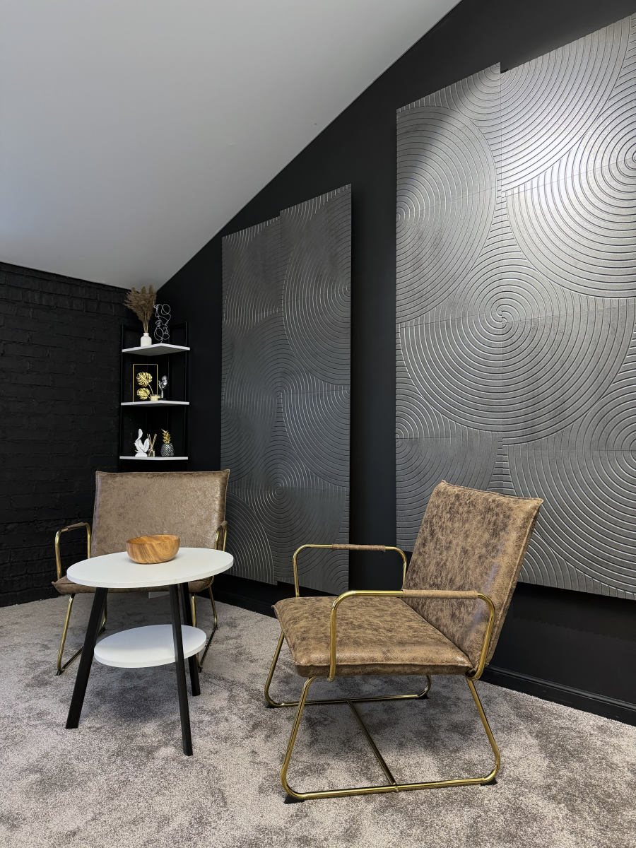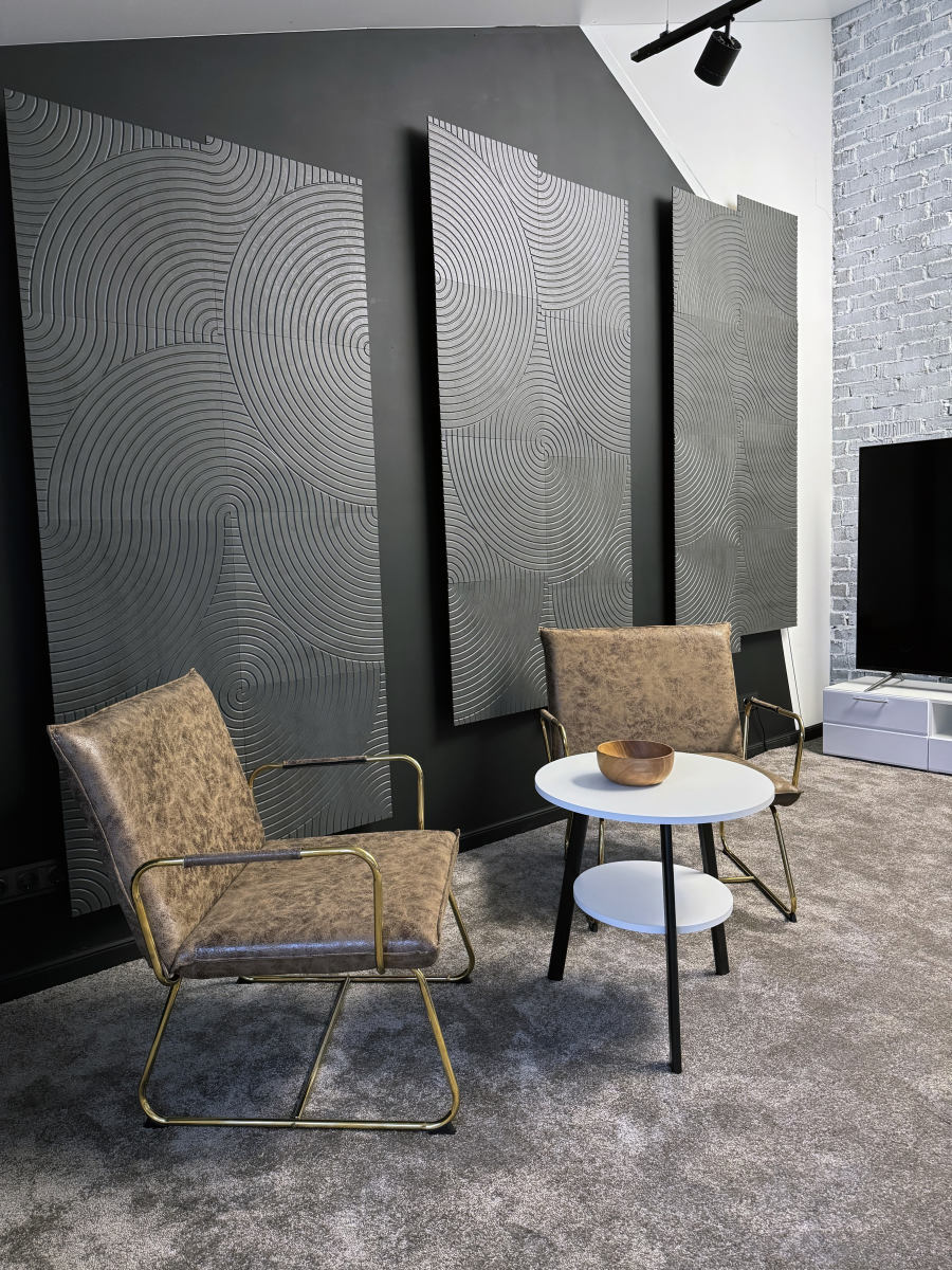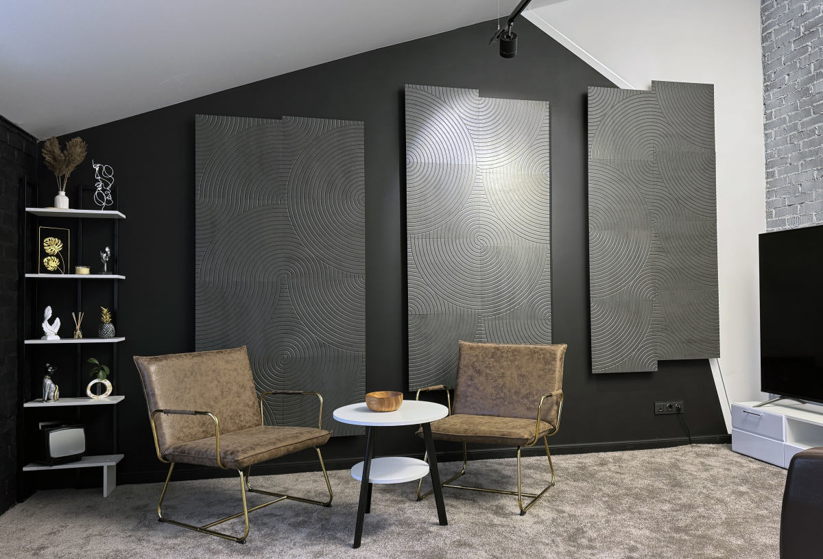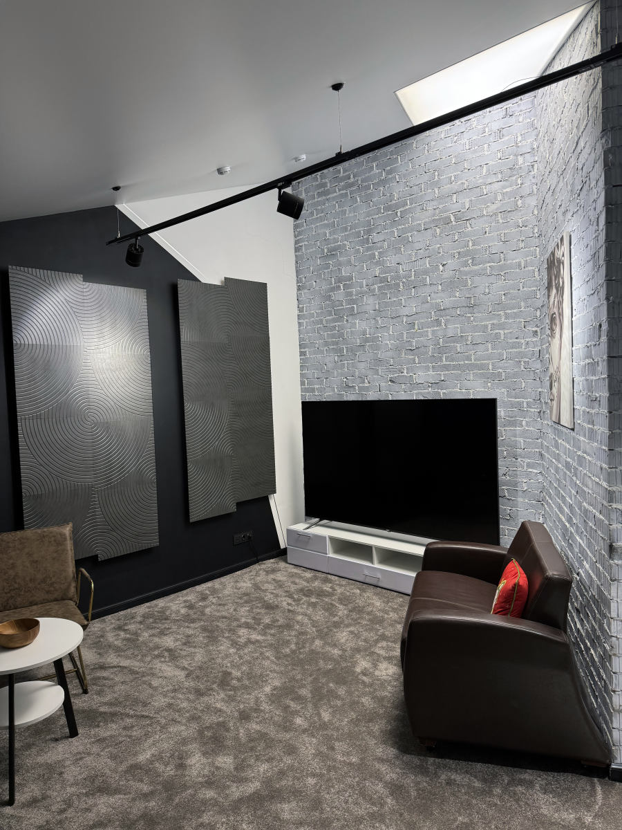 Тёмная фактурная стена, декоративные панели и продуманные детали интерьера создают премиальный, современный визуал, который отлично смотрится в кадре без перегруженных декораций.
