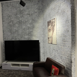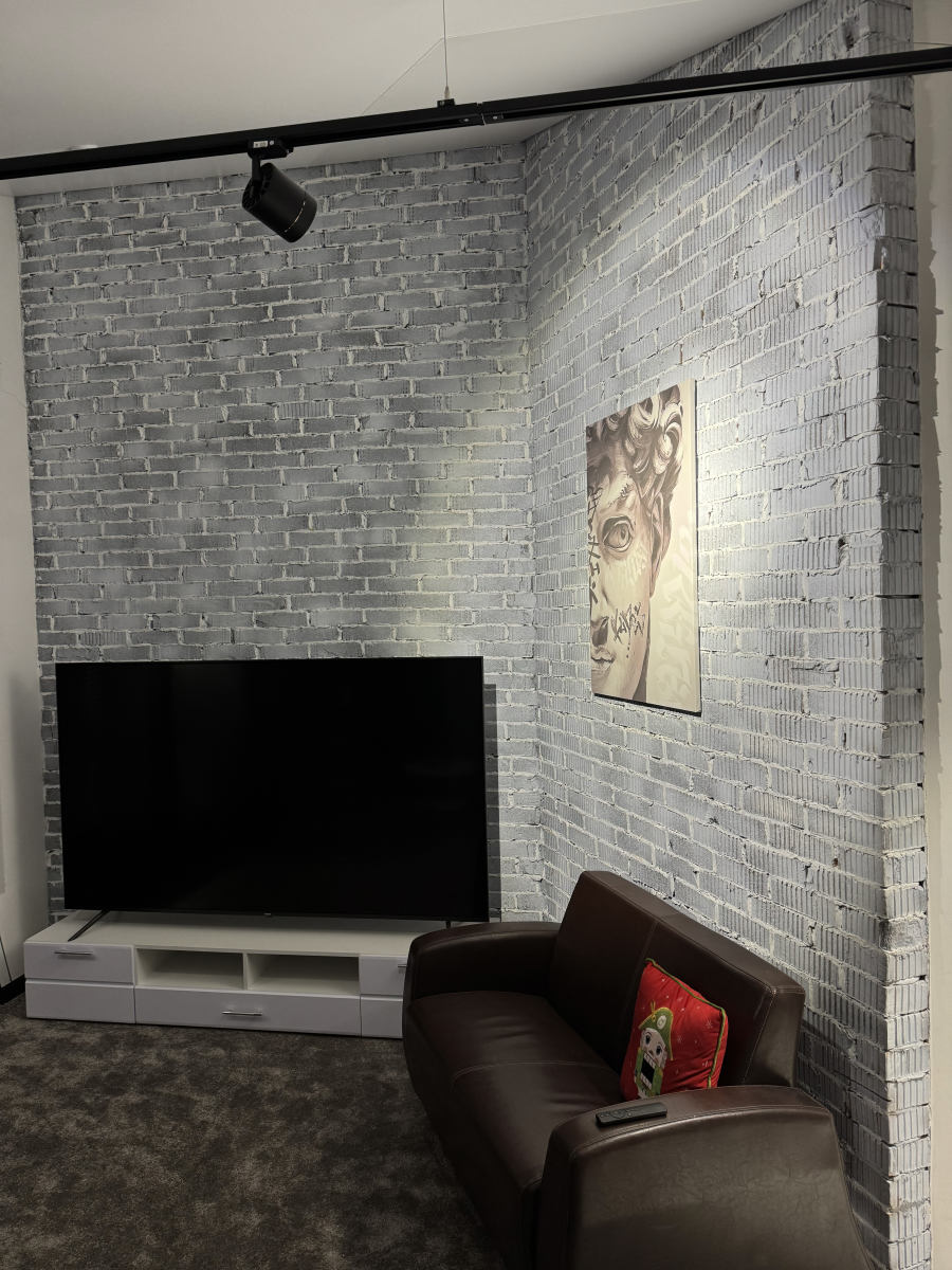 В зале установлен большой 86″ телевизор, который можно использовать как фон, для демонстрации презентаций, видео, логотипов или интерфейсов. Удобный кожаный диван, два дизайнерских кресла и кофейный столик позволяют легко выстраивать разные композиции кадра — от камерных разговорных форматов до динамичных видео-сцен.