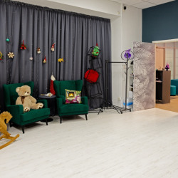 В студии есть отдельная гримерная комната на 2 места с большими зеркалами с подсветкой и примерочной. Есть зона ожидания с чаем и вкусняшками.