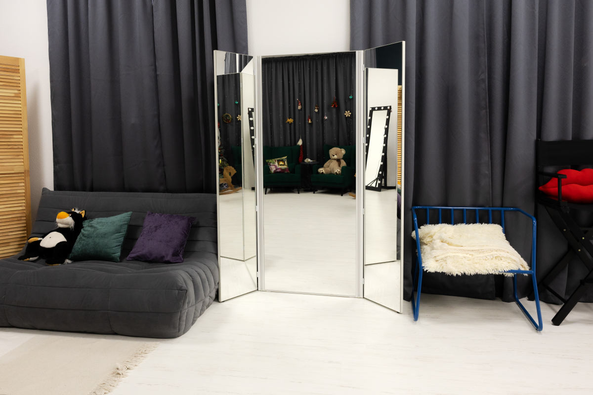 Предметы интерьера и реквизит: два уютных изумрудных кресла, диван с дизайнерскими подушками, гримерное зеркало с подсветкой в полный рост в стильное черной раме, зеркало на колесиках, разнообразные стулья, журнальный столик, манекен и др.