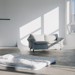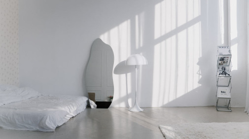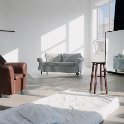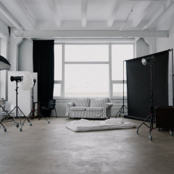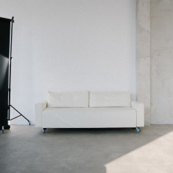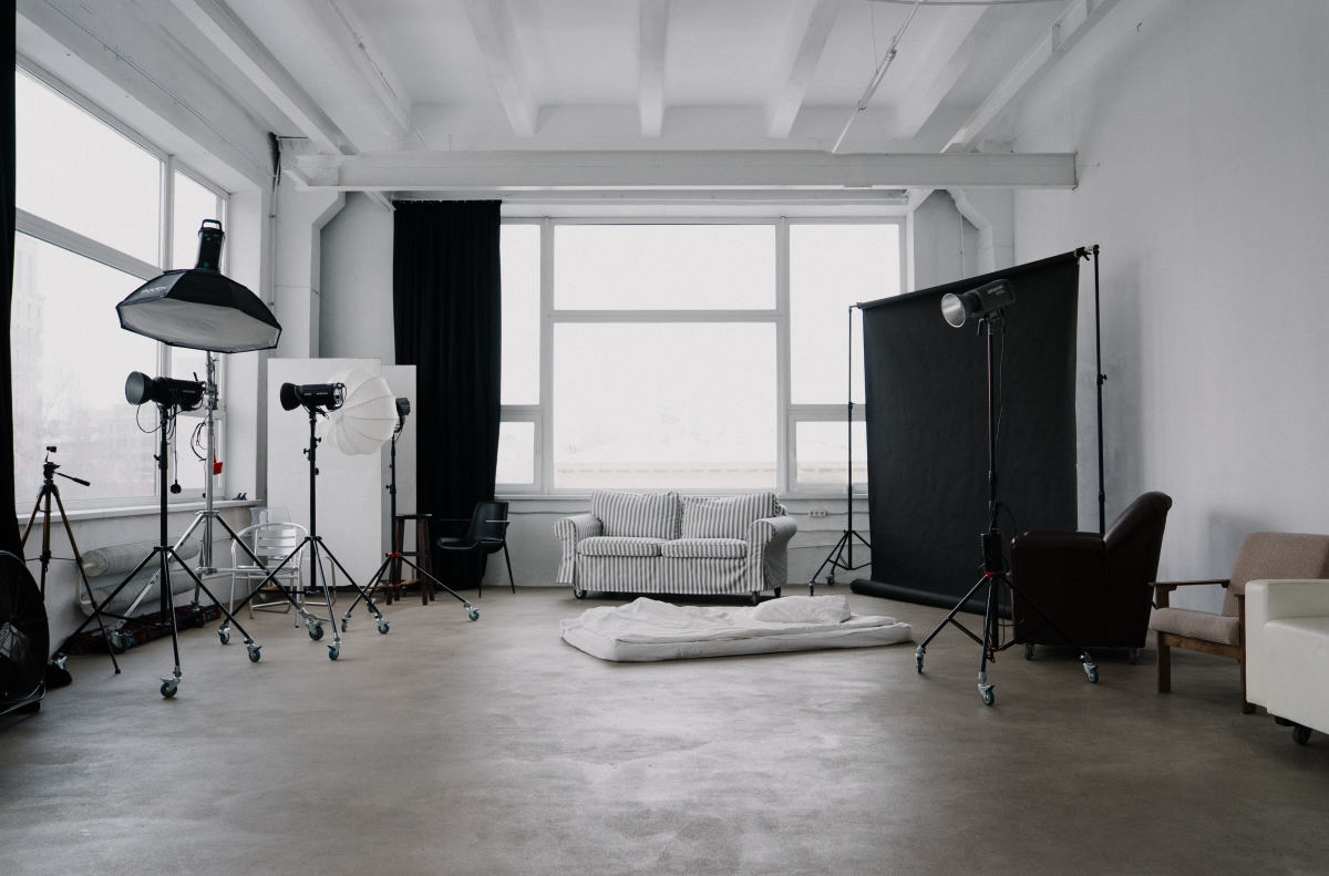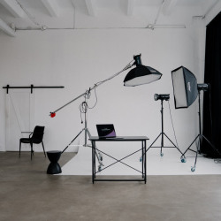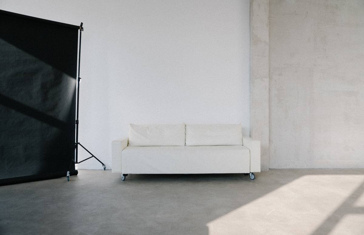Циклорама, фоновая система, белая стена, фактурная серая стена, зеркала, кровать, 2 дивана, стулья на выбор.