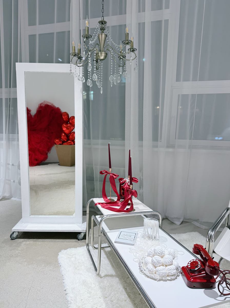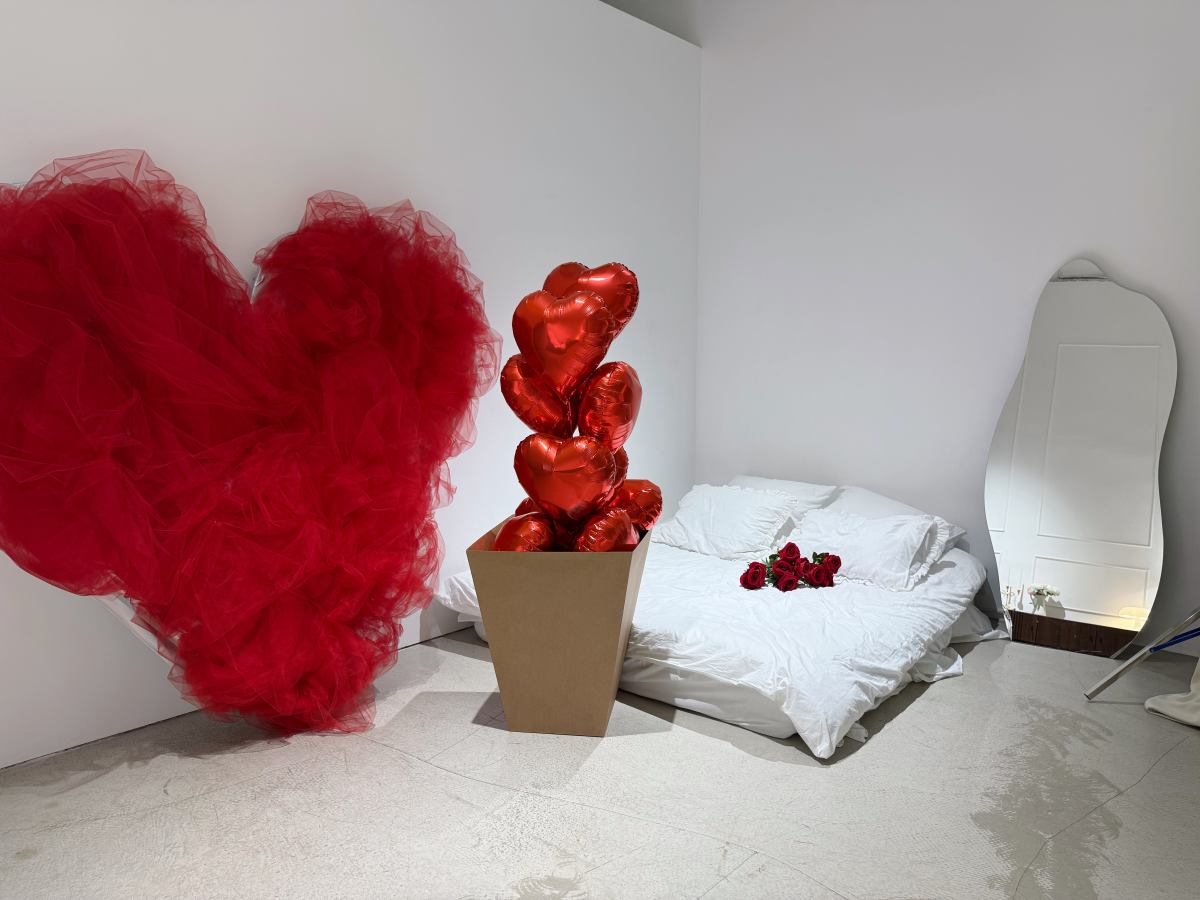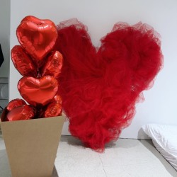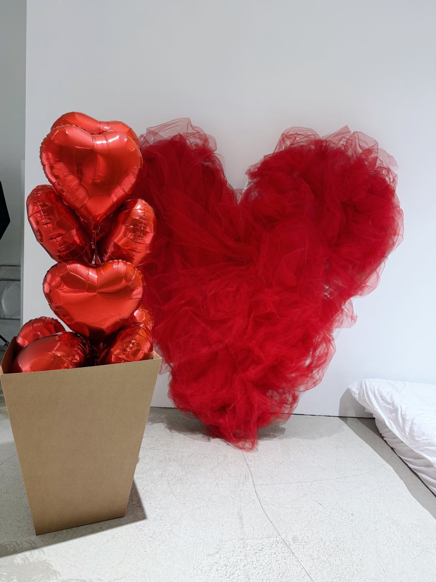 Декорации ко Дню Святого Валентина: шарики, сердце 2х2м, свечи, розы создают атмосферу романтики.
